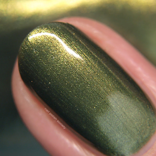 Verdant is a khaki green metallic with golden shimmer. This is 100% a perfect Fall color! It is slightly streaky but the shimmer is so gorgeous that it's forgivable. Shown is two coats, plus top coat.