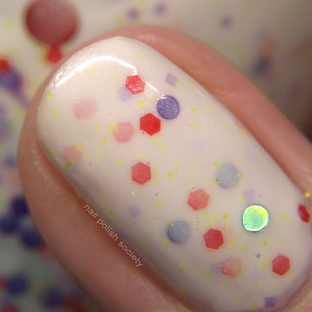 Cherry On Top is a white crelly base with red shimmer, cherry red dots, neon yellow micro glitter, purple and baby blue dots, and hot pink matte glitter. I wasn't able to fish out any of the large red circle glitters but I didn't mind because I like how it looked without. This one is really sheer so I touched it up a little where the darker spots were. Shown is three and 1/2 coats plus top coat.