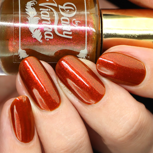 by Dany Vianna Samhain is a glowy brown/orange with aurora shimmer. Shown is two coats plus top coat. $12, 280 US/20 UK cap