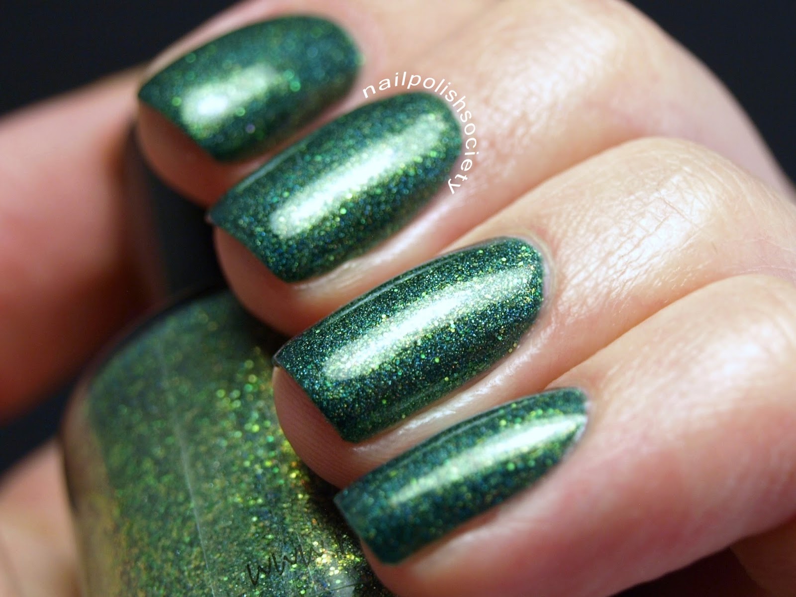 Emerald Envy is from Renaissance Cosmetics' new Wunderkammer Collection. It is a gorgeous emerald (go figure) green, with sparkly gold glitter and a wonderful holographic shimmer. The combination of the colors and glitters is really amazing. As for the application, I was pleasantly surprised by how much came off the brush on the first coat, and how even it was. I could get away with just one coat, but for photos I did two. Shown with topcoat.