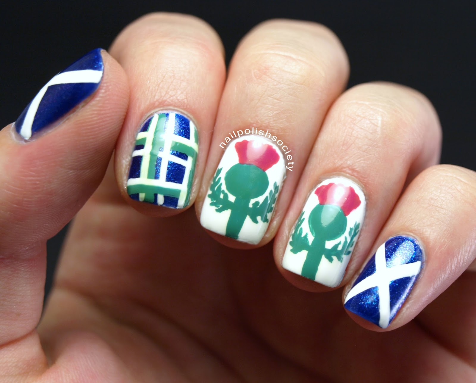 The designs on my mani are representing the Scottish flag, Scottish thistle, and a random plaid pattern I made up. I originally wanted to try and improve on my Tartan nails that I did last year, but I forgot my plan until the last minute had to come up with this instead.