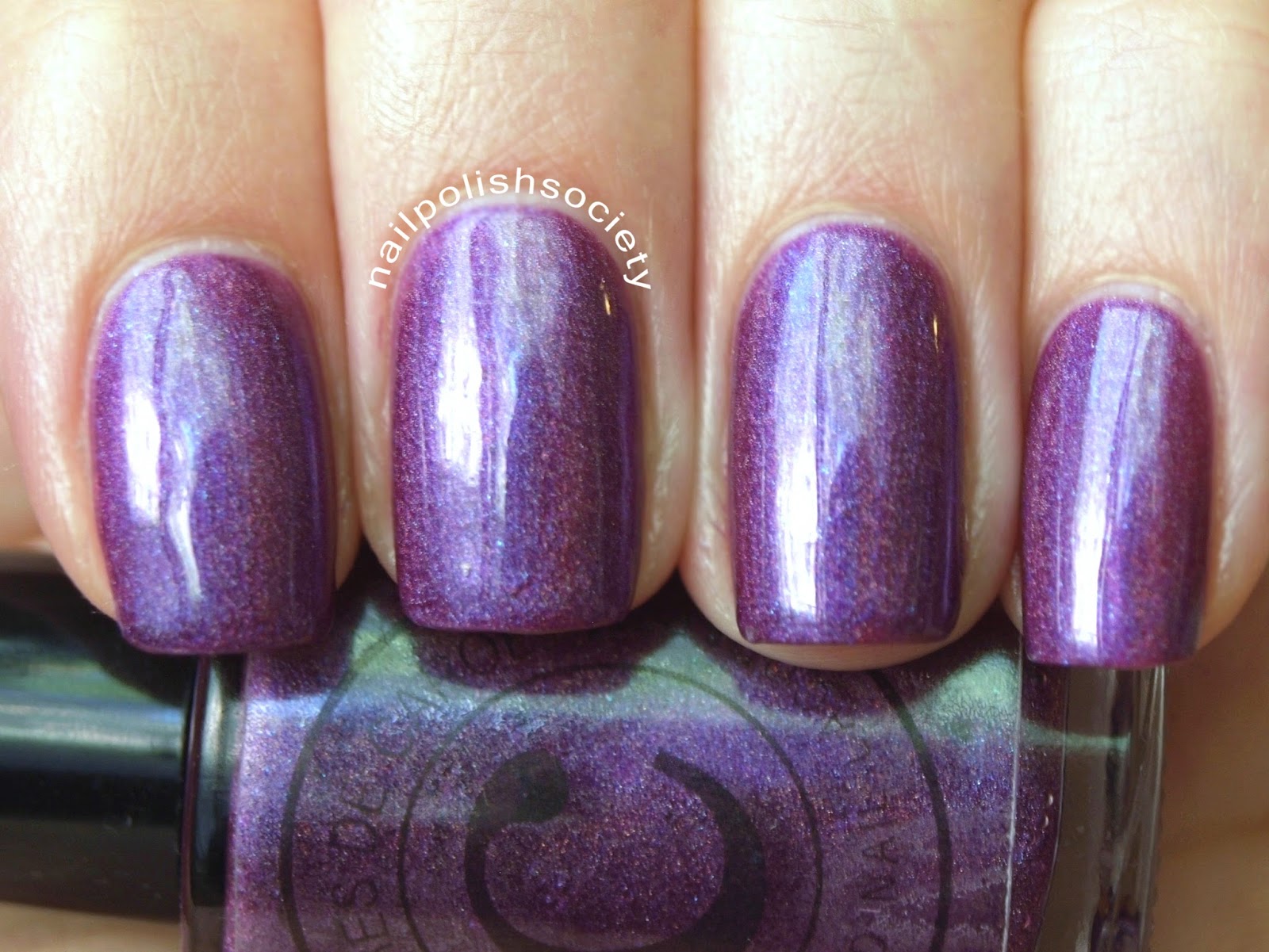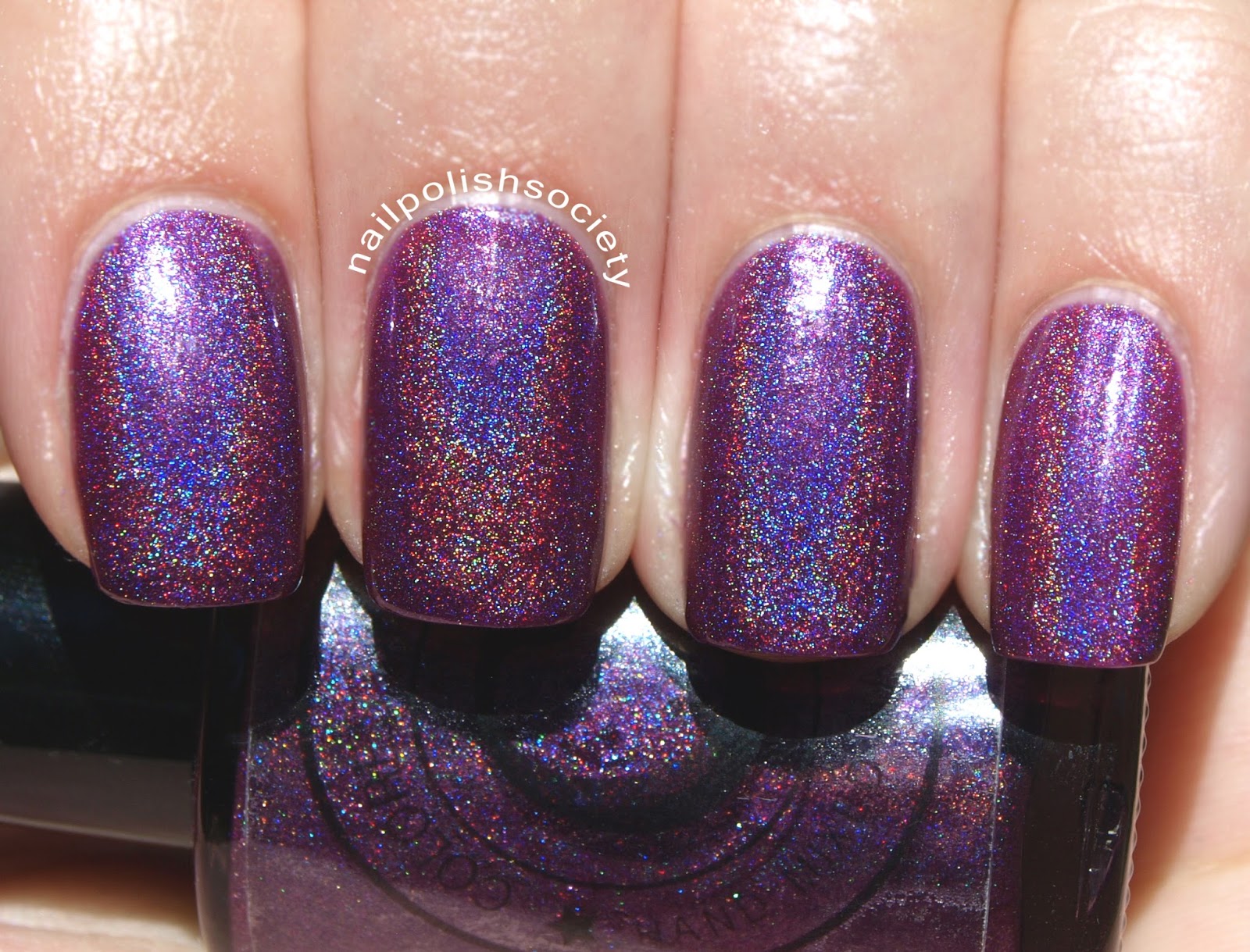 Amethyst is described as a "linear holographic medium purple with blue shimmer". In direct sunlight the blue shimmer isn't very noticeable amid the holo sparkle, but is a little more visible in the shade. This is two thin coats, plus topcoat.