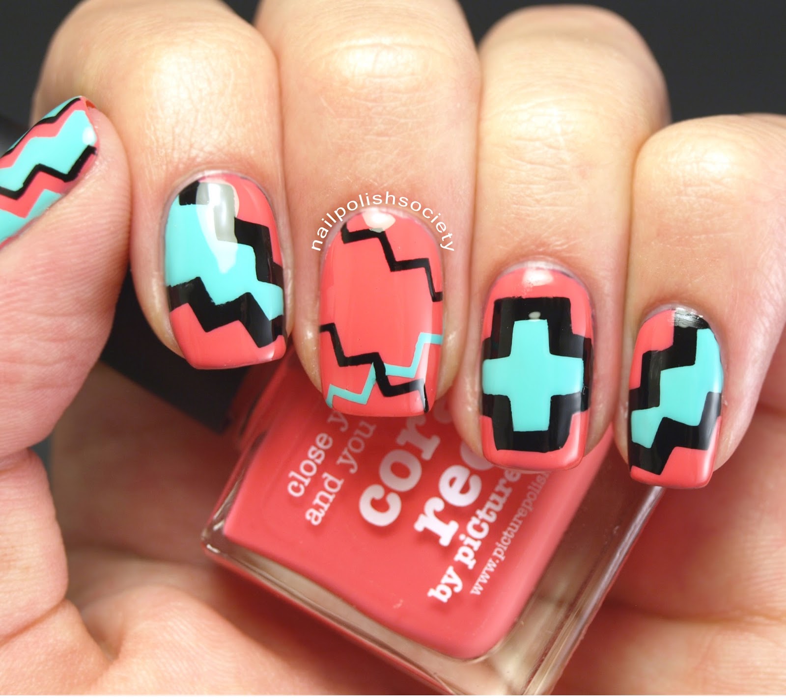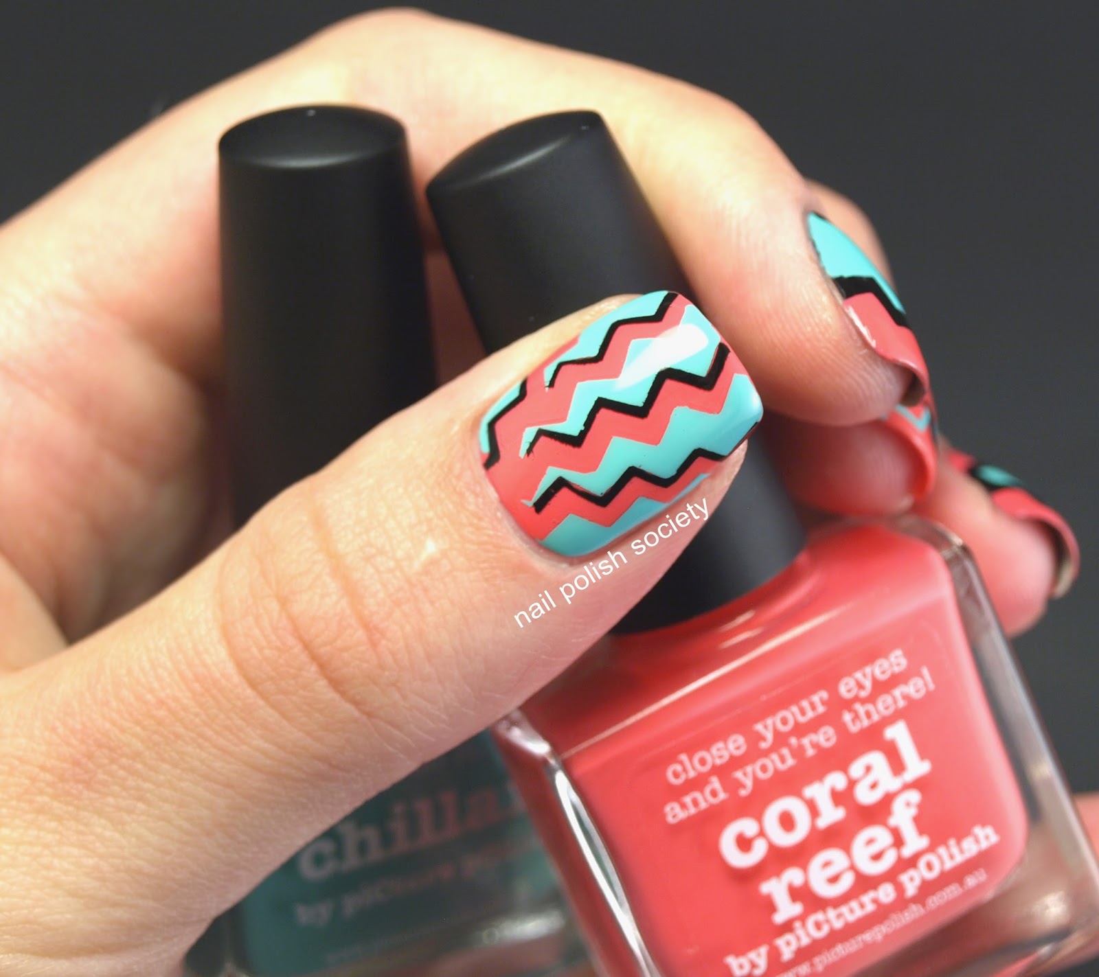 - After double checking that each strip is lying as flat as possible, unscrew the lid to both polishes. Be aware of the order that you applied the vinyls. Working quickly, apply piCture pOlish Chillax in the center negative space, then piCture pOlish Coral Reef on the outer negative spaces. Immediately begin removing vinyls with tweezer, starting in the reverse order they were placed. You may want to place a finger on the strip underneath so that it stays in place while you remove the top one. I also try to remove them "against the grain" for the cleanest lines.