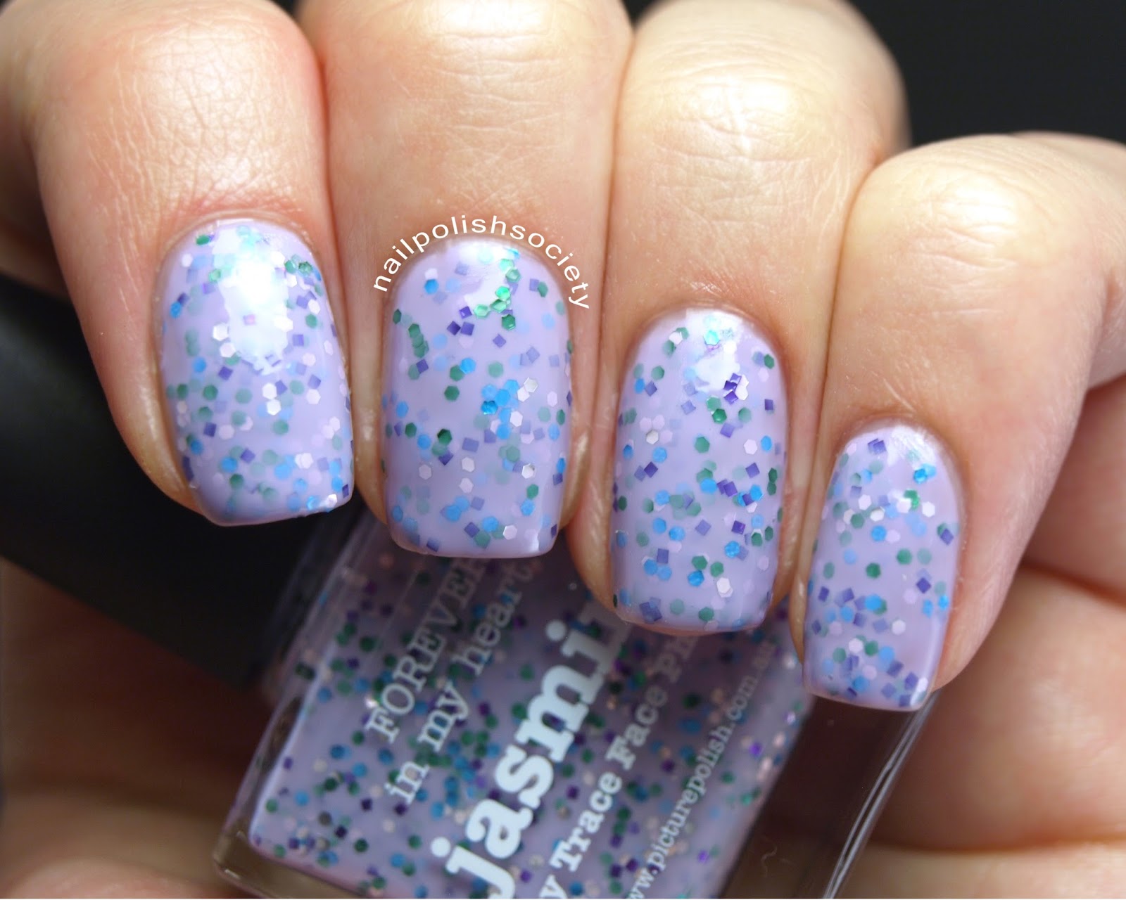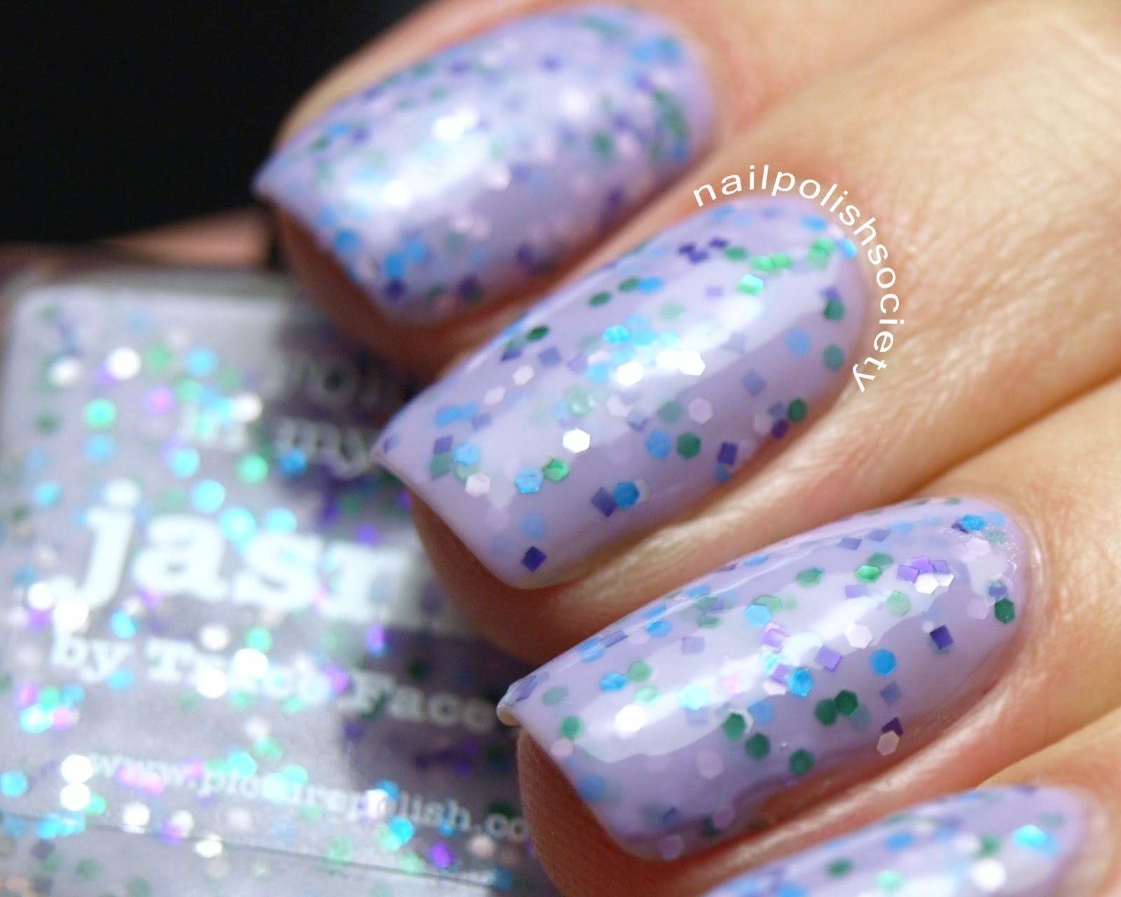 Jasmine is a collaboration shade created by Tracey The TraceFace Files. It is a lavender creme packed full of green, silver, and bright blue hex glitters, and purple square glitters. Shown is two coats plus topcoat.