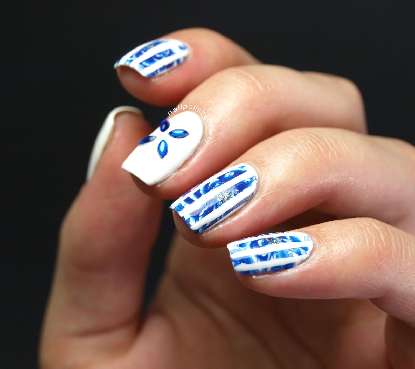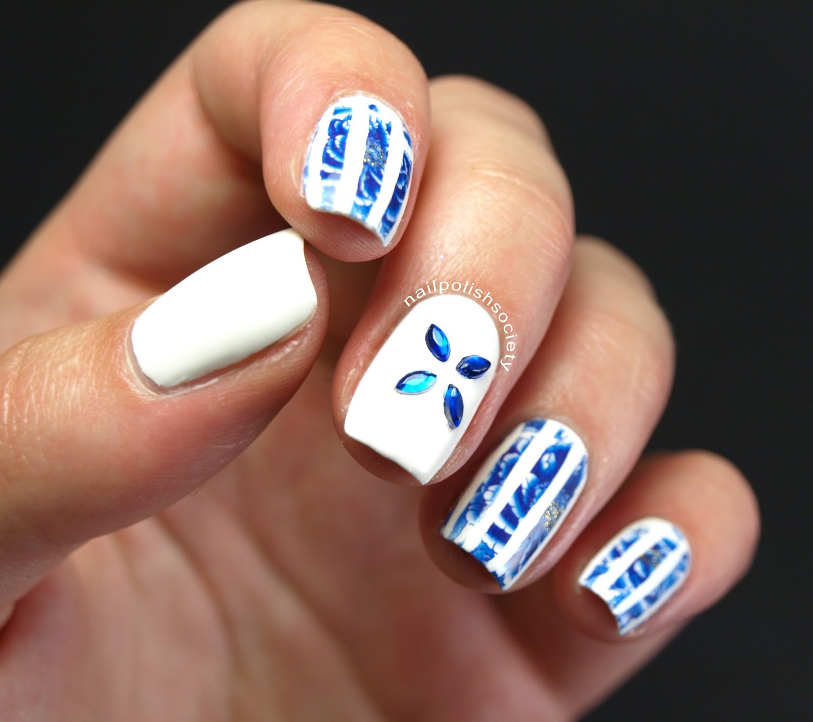 Today has been busy, busy. So I needed to figure out a mani that was quick and easy, but I still needed it to look good of course! Ever since my dear friend Emily of Very Emily did this fabulous guest post for me, I've been wanting to copy her design. I just love the concept of these stripes over the floral decals. I put my own twist on it and am loving the result.