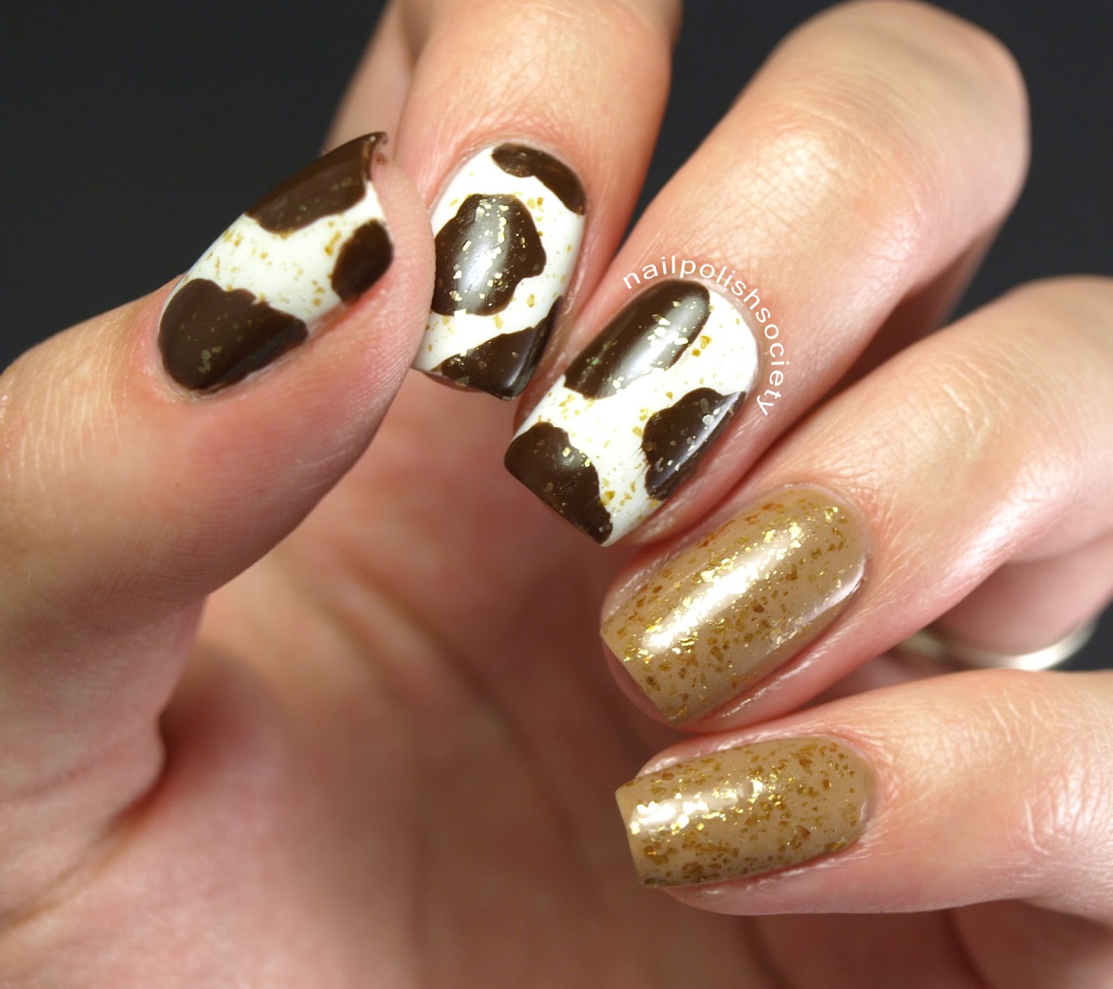On my "to try" list I've been wanting to experiment with cow print. I thought today was as good an opportunity as ever. I love how unexpected the gold flakie is over the cow print. I must lament how flakies never photograph as well as they look in person. So you'll have to just imagine that they looked even better than this!