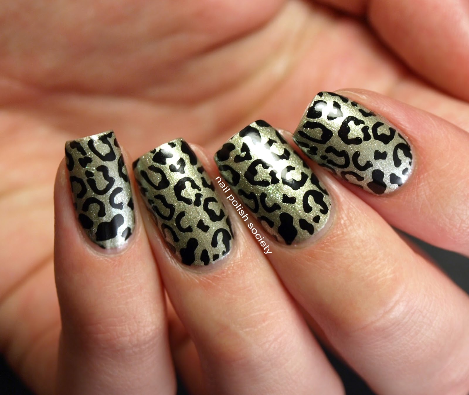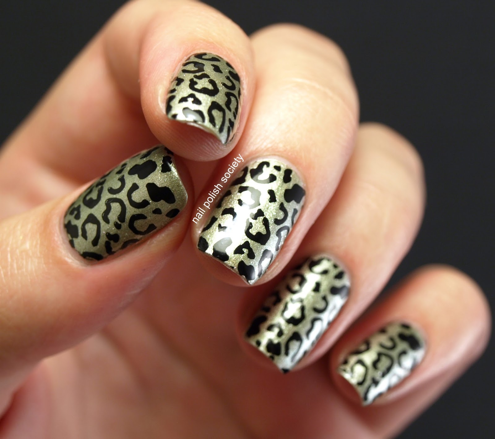 This is actually the first time I've worn A Color That Can't Be Tamed because it's a very sheer shimmery topper. It's a really strange non-color. Somewhere in between a silver, gold, tan, and green.I didn't want to do three or four coats of it, so instead I layered it over one coat of silver polish. Then I stamped the leopard print on top. It was also my first time using this leopard print image. Wow. So much faster than freehand!
