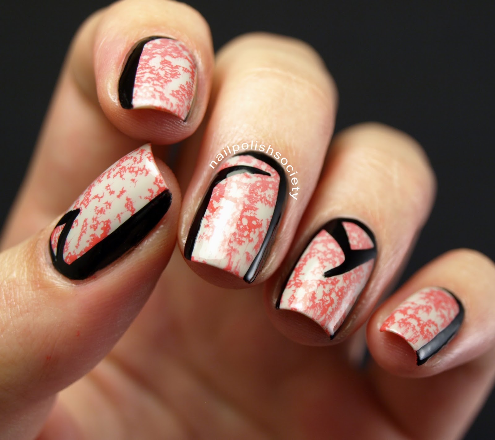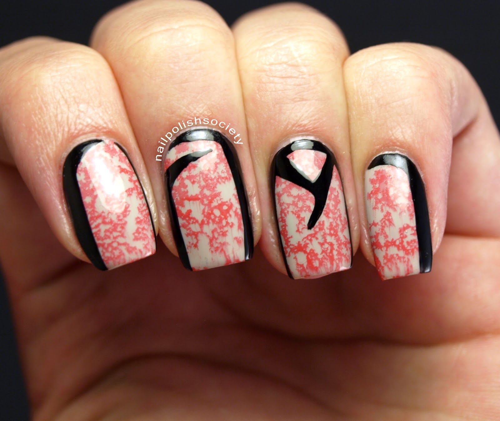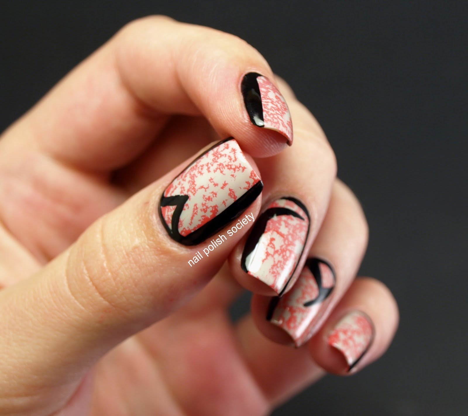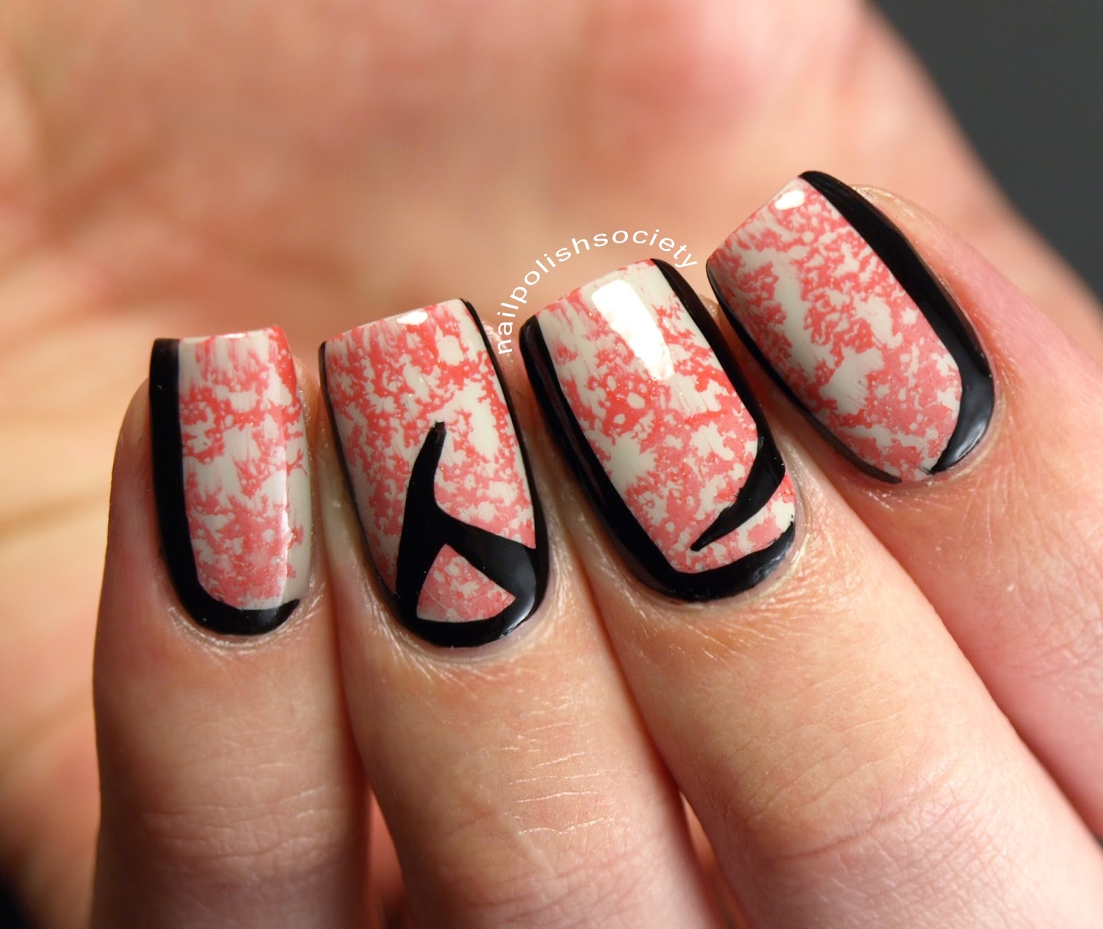 For the textured look with the coral I used the water spotted technique over a nude base. Then I free handed random shapes of black on top.