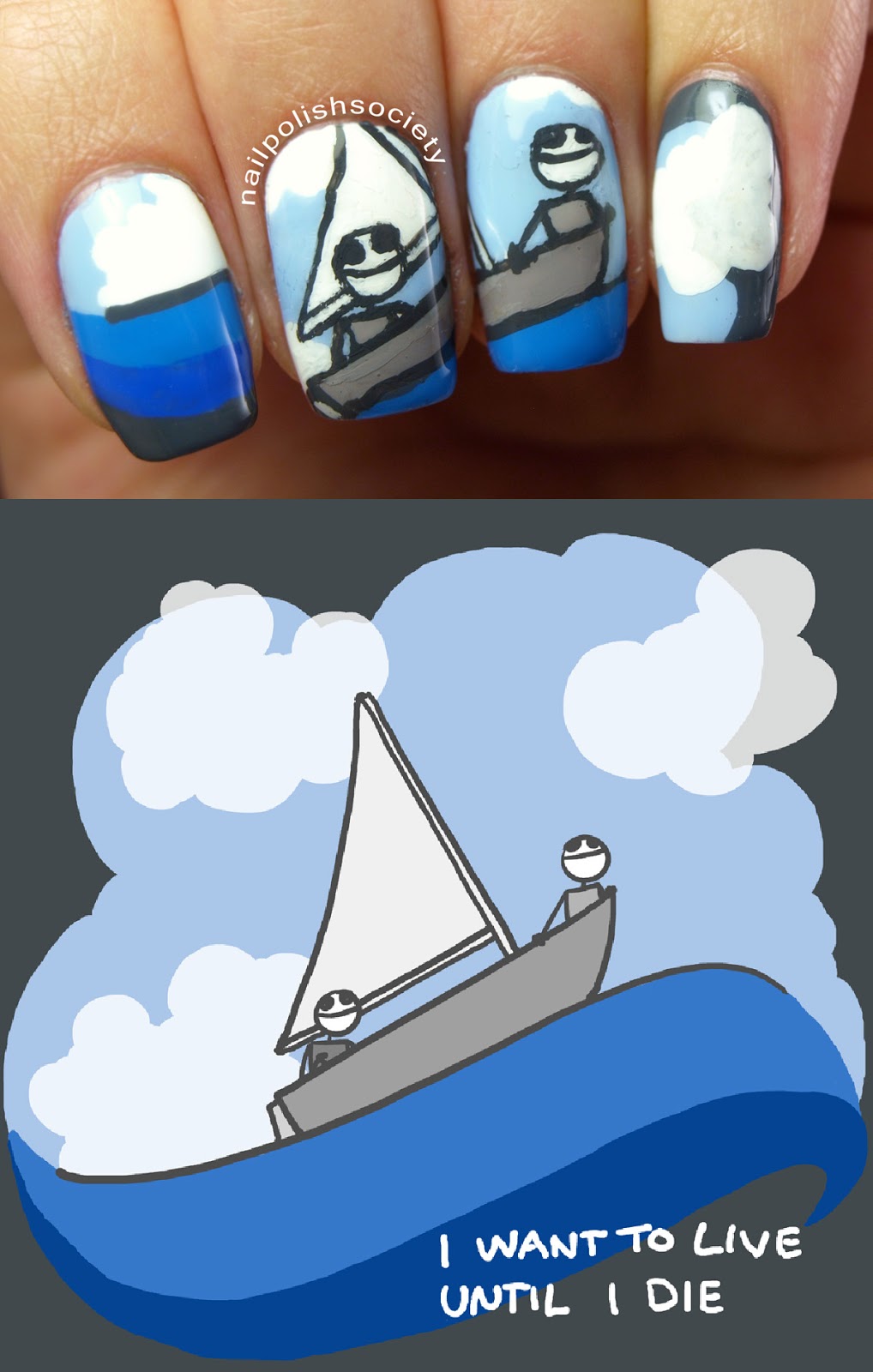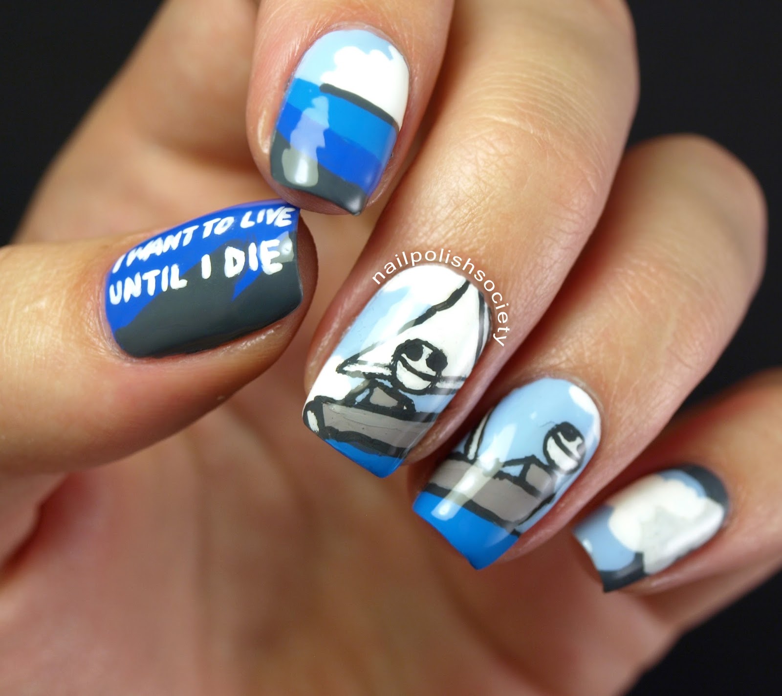 I had initially hoped that this year's Inspired by Artwork mani wouldn't take me as long or be as stressful as last year's Banksy nails. But once again I really wanted to try my hardest to do this artwork justice. Today's mani was inspired by a piece titled "I Want To Live Until I Die" by Sam Brown, the artist behind Explodingdog.com. I knew I wanted to do an image from Explodingdog, but had the hardest time choosing which one! Finally I decided on this one because it is so joyful and just felt right.