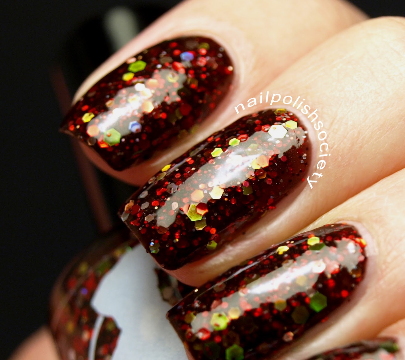 Red Death is the real show stopper in this collection. There's so much drama going on here. I think it was perfect representation of the Phantom in his masquerade costume. It's described as a "blackened rust jelly base with red, silver, lime green, and yellow glitter and dark red shimmer". The formula was really good. I didn't have any issues with having to fish glitters, and they laid flat on the nail. Two coats, plus topcoat.