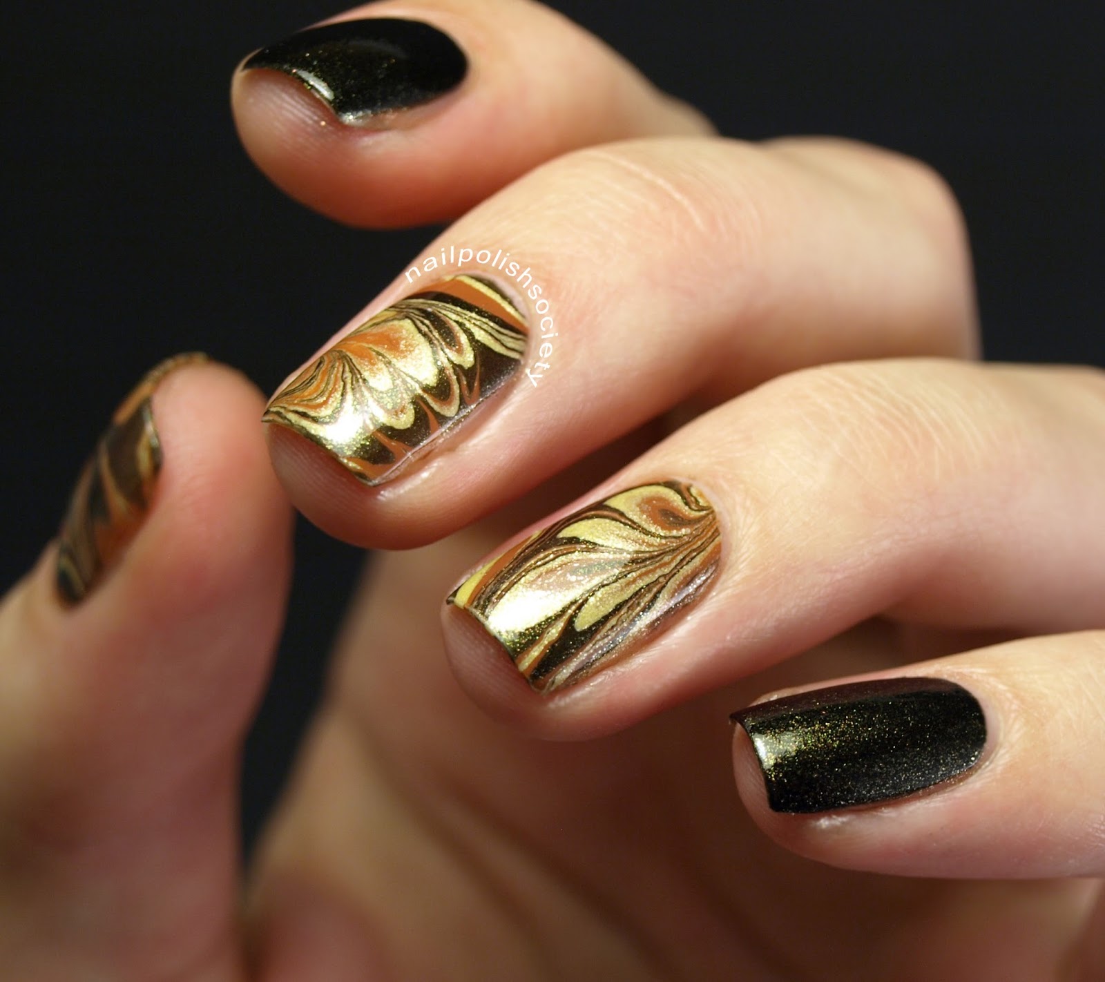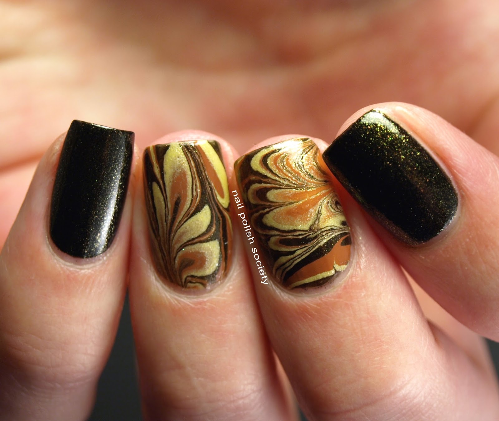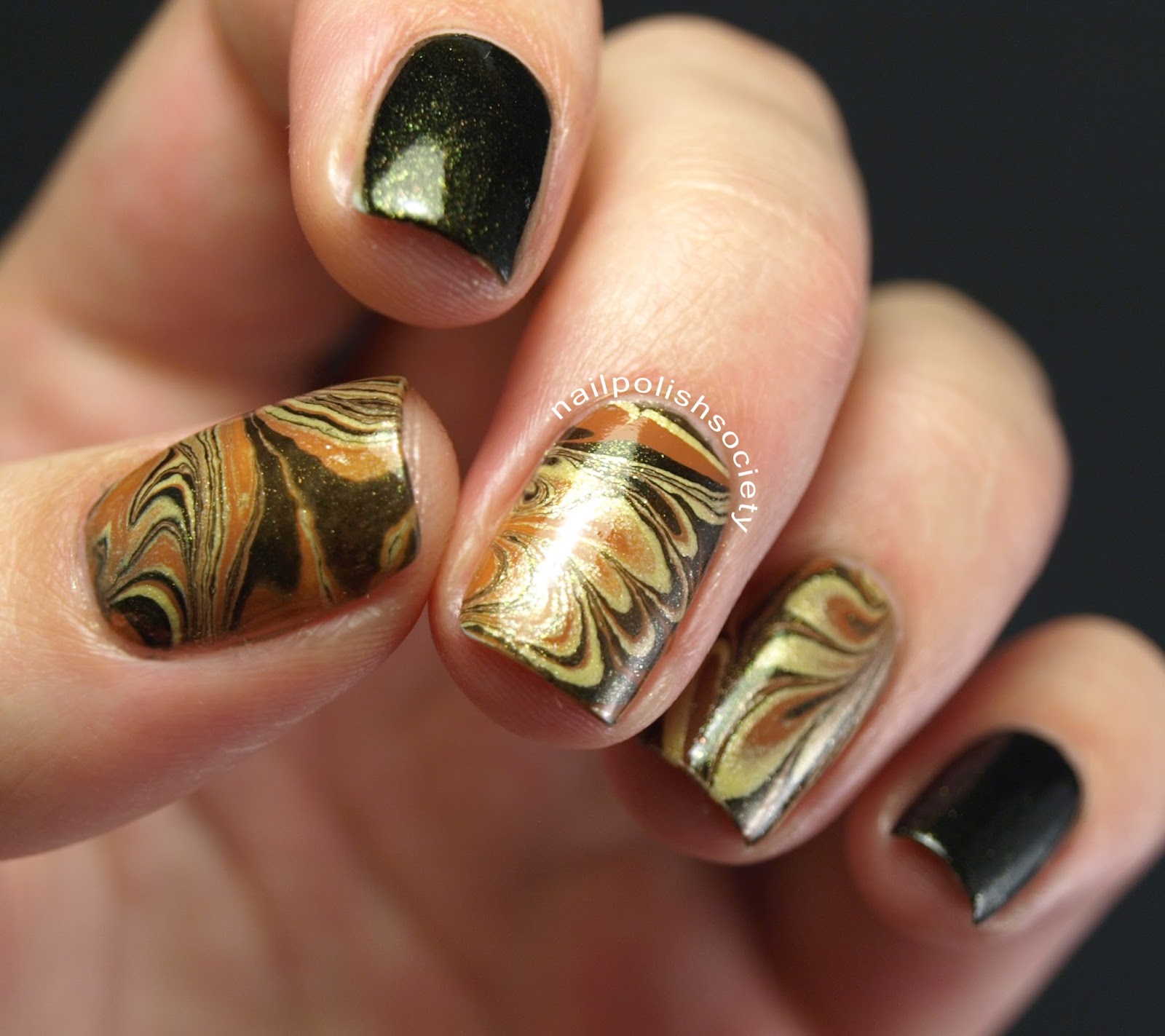 I wanted my water marble designs to look varied and irregular, because it usually looks better than when I plan it out. So it wasn't my intention, but I love how the design on my ring finger turned out looking like leaves.