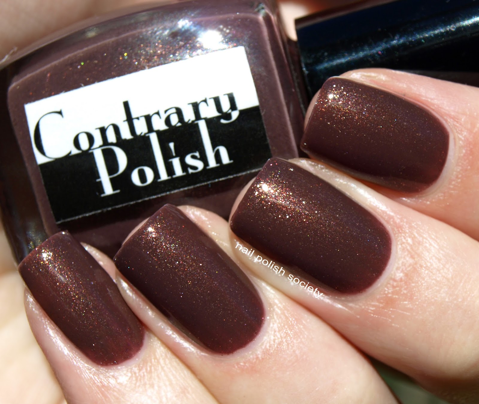 Contrary Polish Gilded Oak is a lovely purple-ish brown with golden shimmer. You know how I love my browns, and this is no exception. Contrary Polish is so good at making such wearable, yet intriguing shades like this. This is two coats (probably should have done three for photos), plus topcoat.
