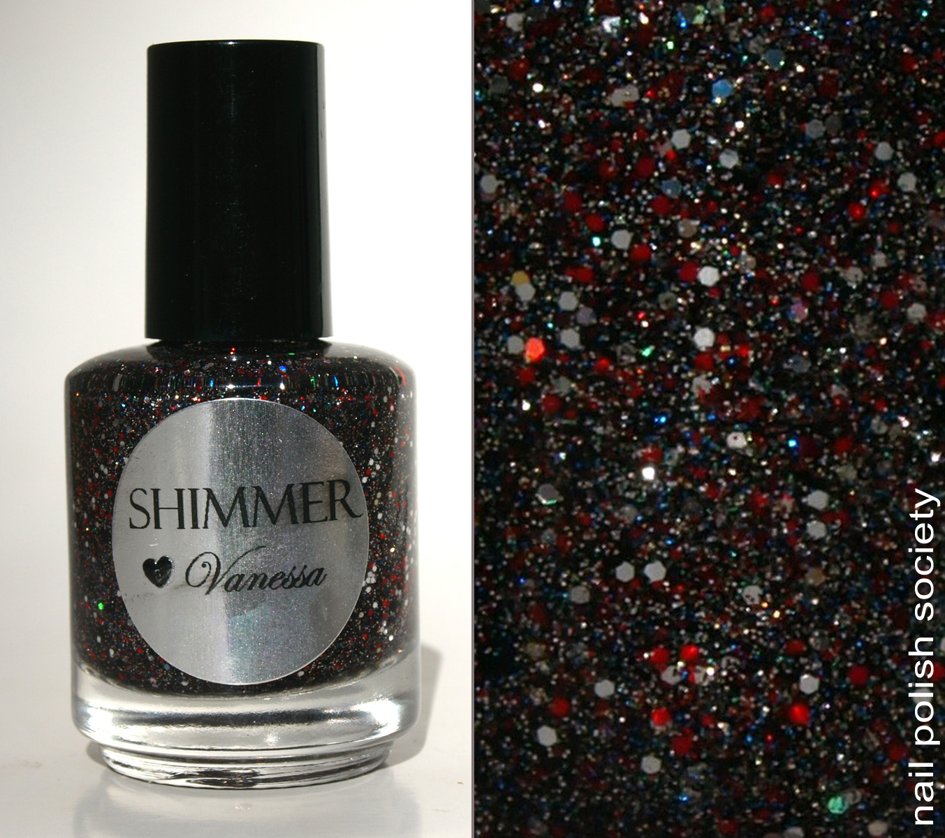I think Vanessa is a great name for this shade as I somehow image her as an intense gothic type or perhaps a biker chick. Don't ask me why. The suspension base is a very sheer black and is filled with black, red, and silver holographic hex glitters and fine black and silver microglitter. This is two coats plus topcoat.