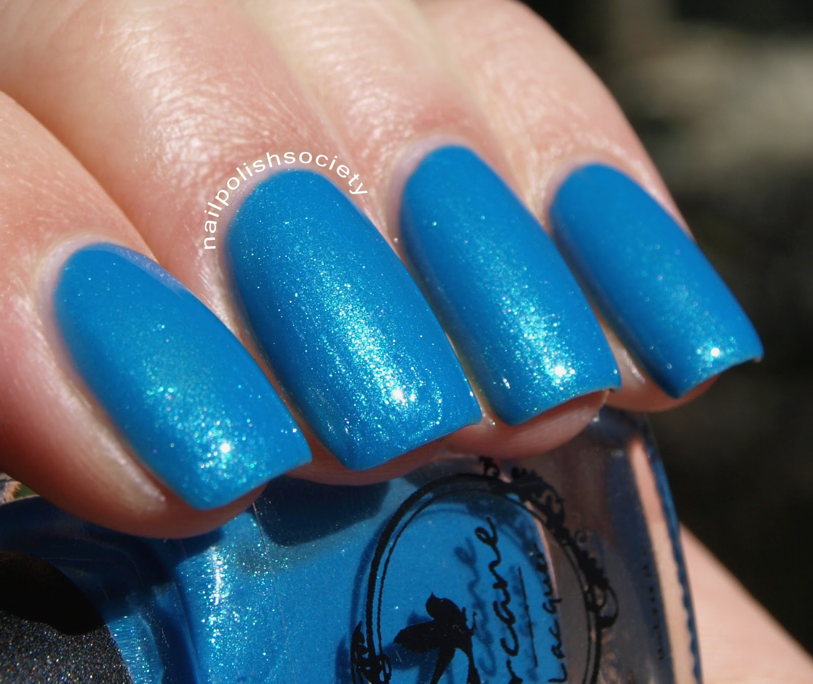 Respite Lane is a brilliant bright blue with a green micro shimmer and green flecks. The finished effect looks quite creamy, but it is actually a thinner formula. This is three coats, plus topcoat.