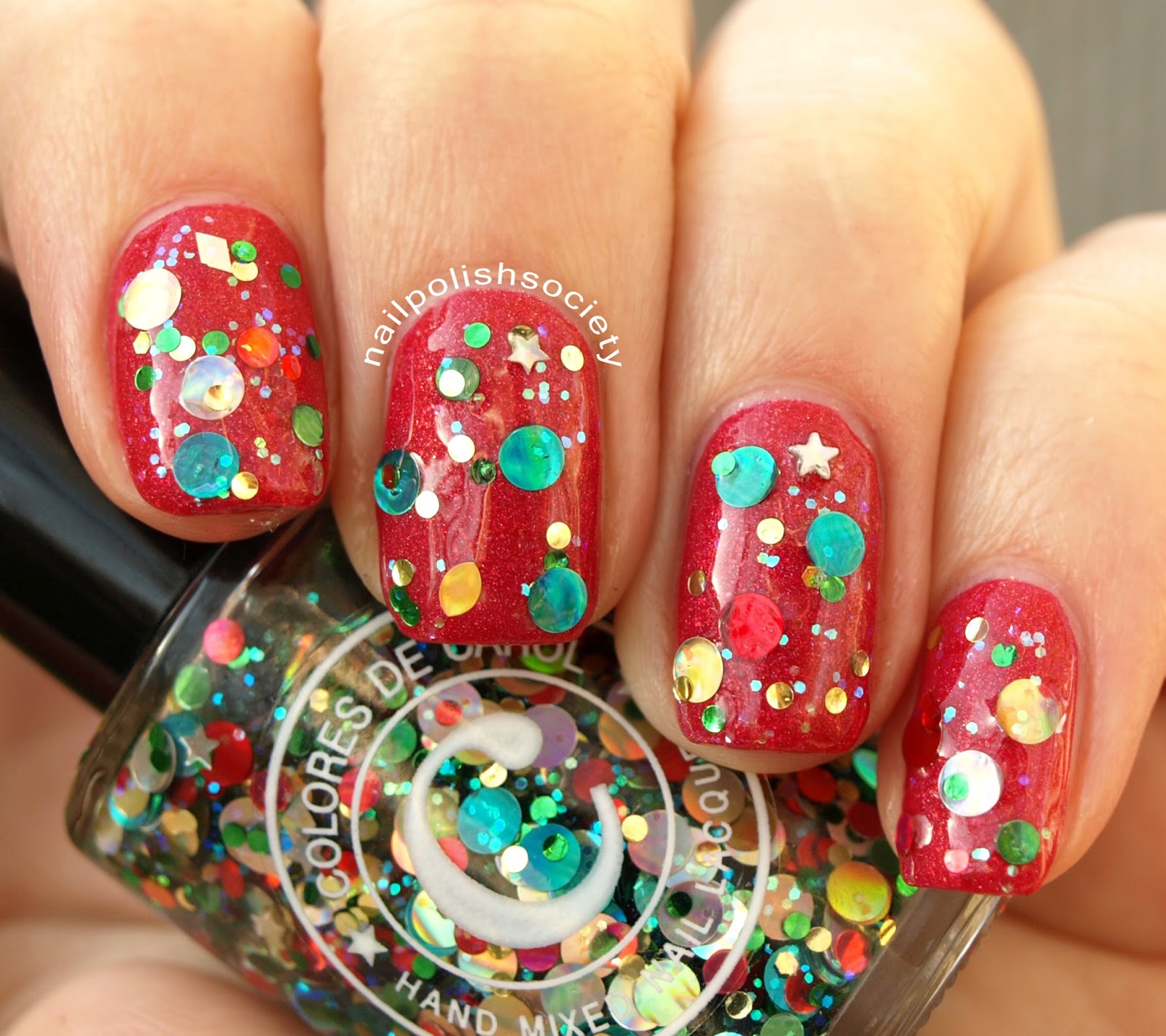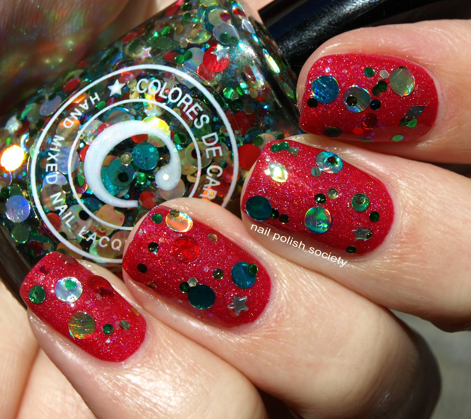 Glitter Garland is blinding with multiple sized and shaped holographic green, red, gold, and silver glitters in a clear base. Looking at it I can't help but imagine having a Christmas tree full of ornaments matching these glitters. Wouldn't that be glorious? Again, the size of the glitters require some placement. This is one coat, plus topcoat.