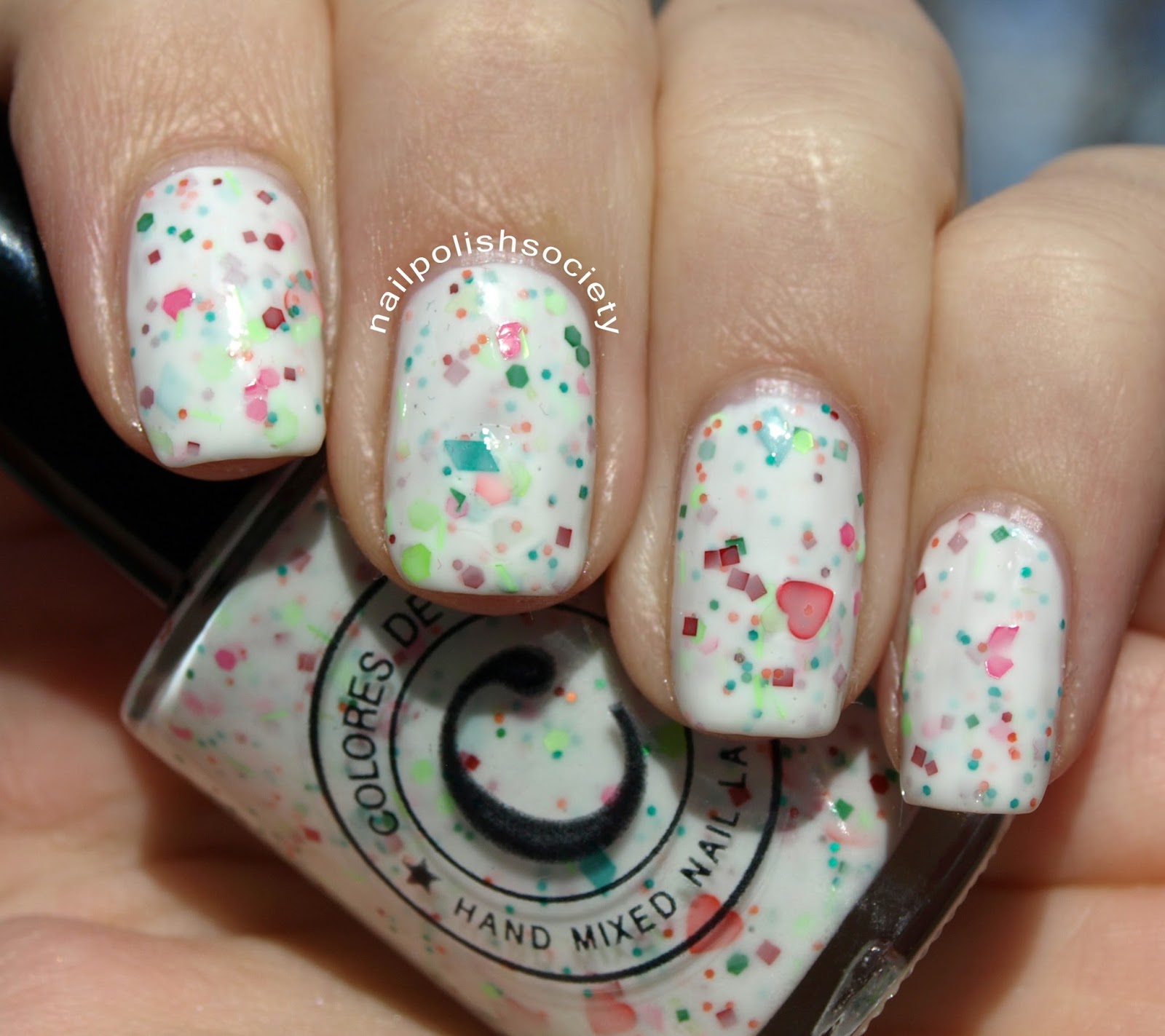 Stockings is a creamy white crelly packed with a plethora of glitter shapes in red, deep green and neon green. This one is really cute and festive! There are so many glitters that are unexpected, my favorite being the parallelograms. Lastly, the neon green is so whimsical and really turns up the party factor. To achieve the opacity I desired I needed three thin coats plus topcoat.