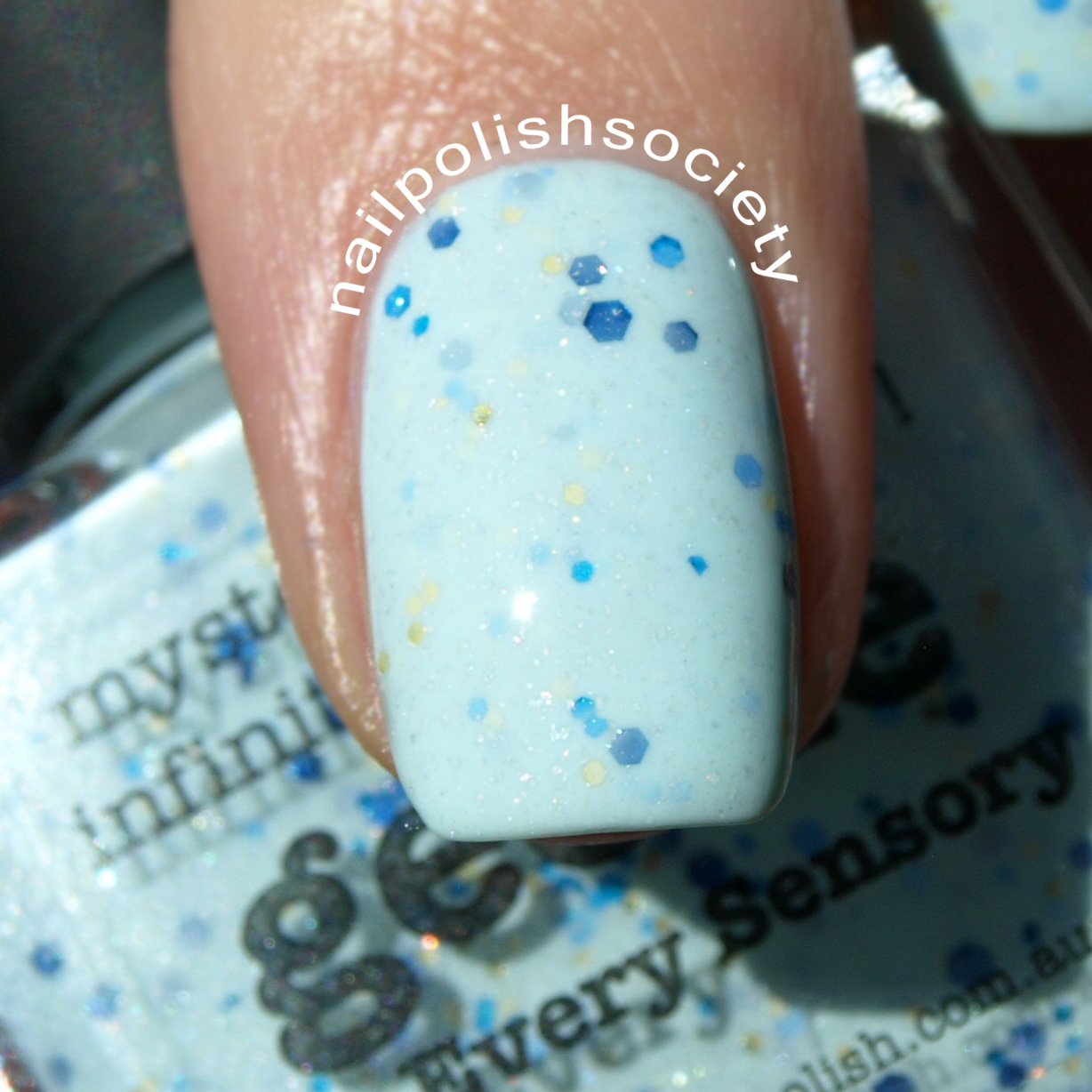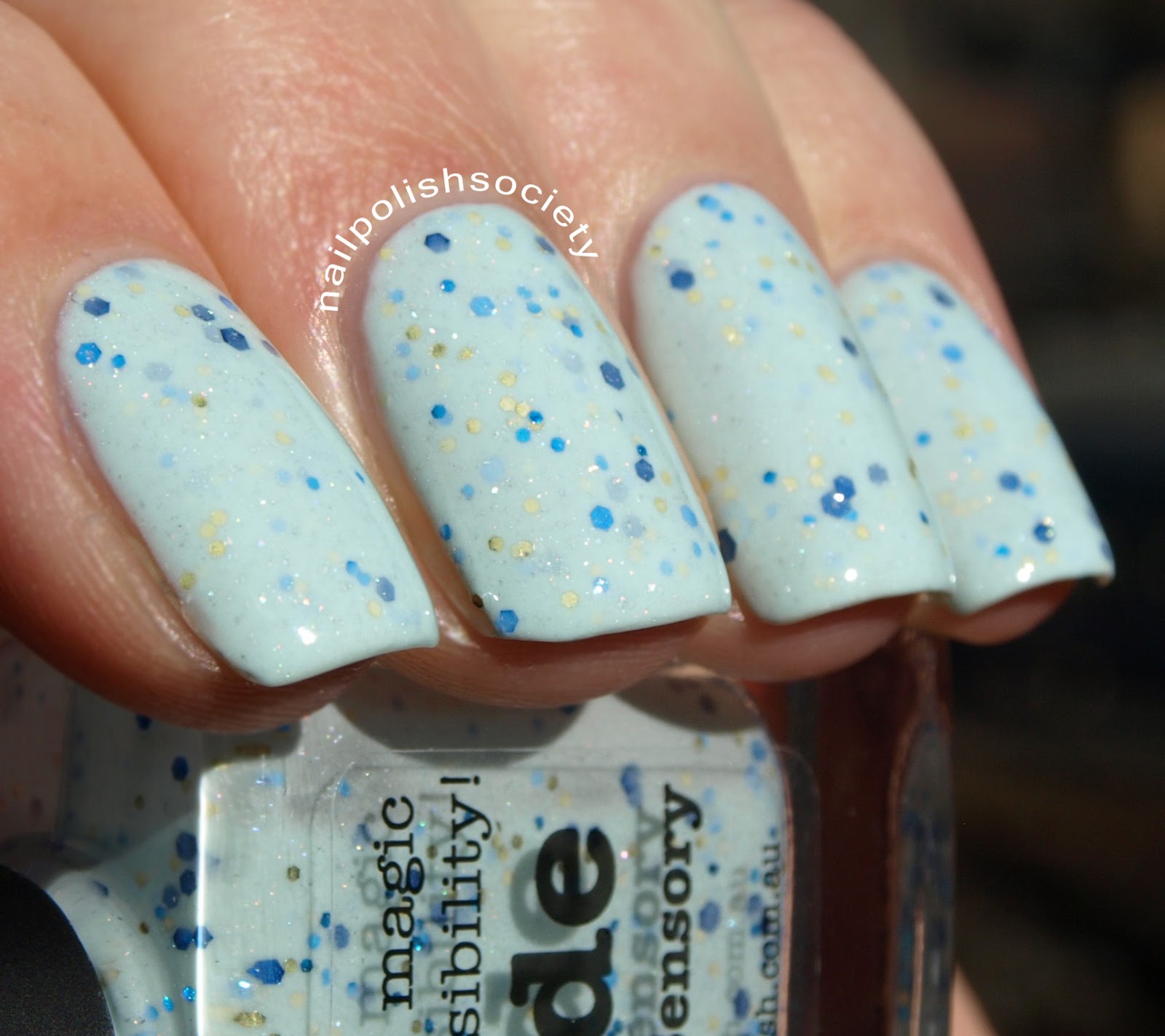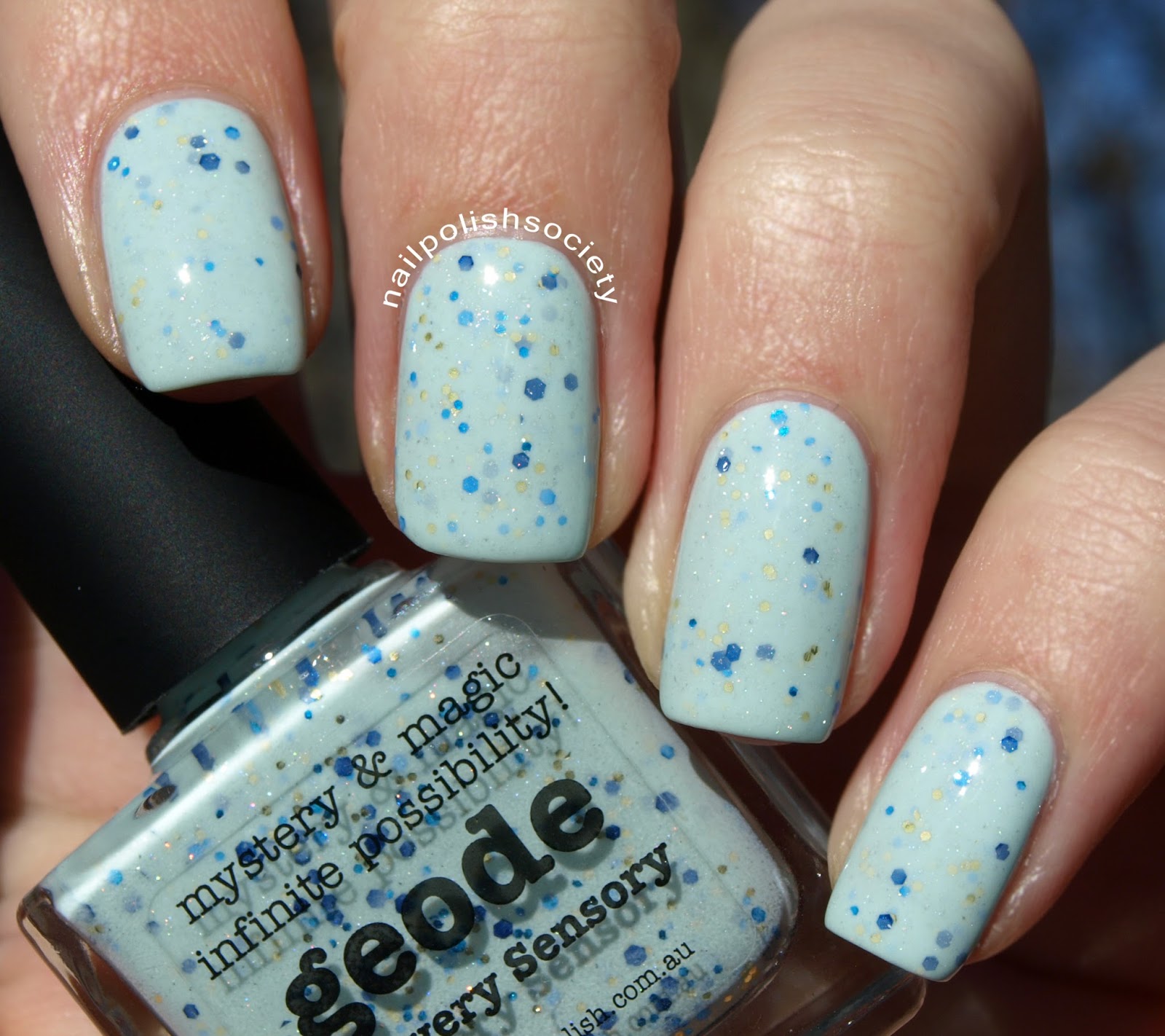 Geode is described as "an egg shell blue with multi-sized hex glitter in royal blue, sea blue and gold dusted with scatter holo." The base of the polish is a creme/jelly which required three coats for opacity, but applied very smoothly. Shown with topcoat.