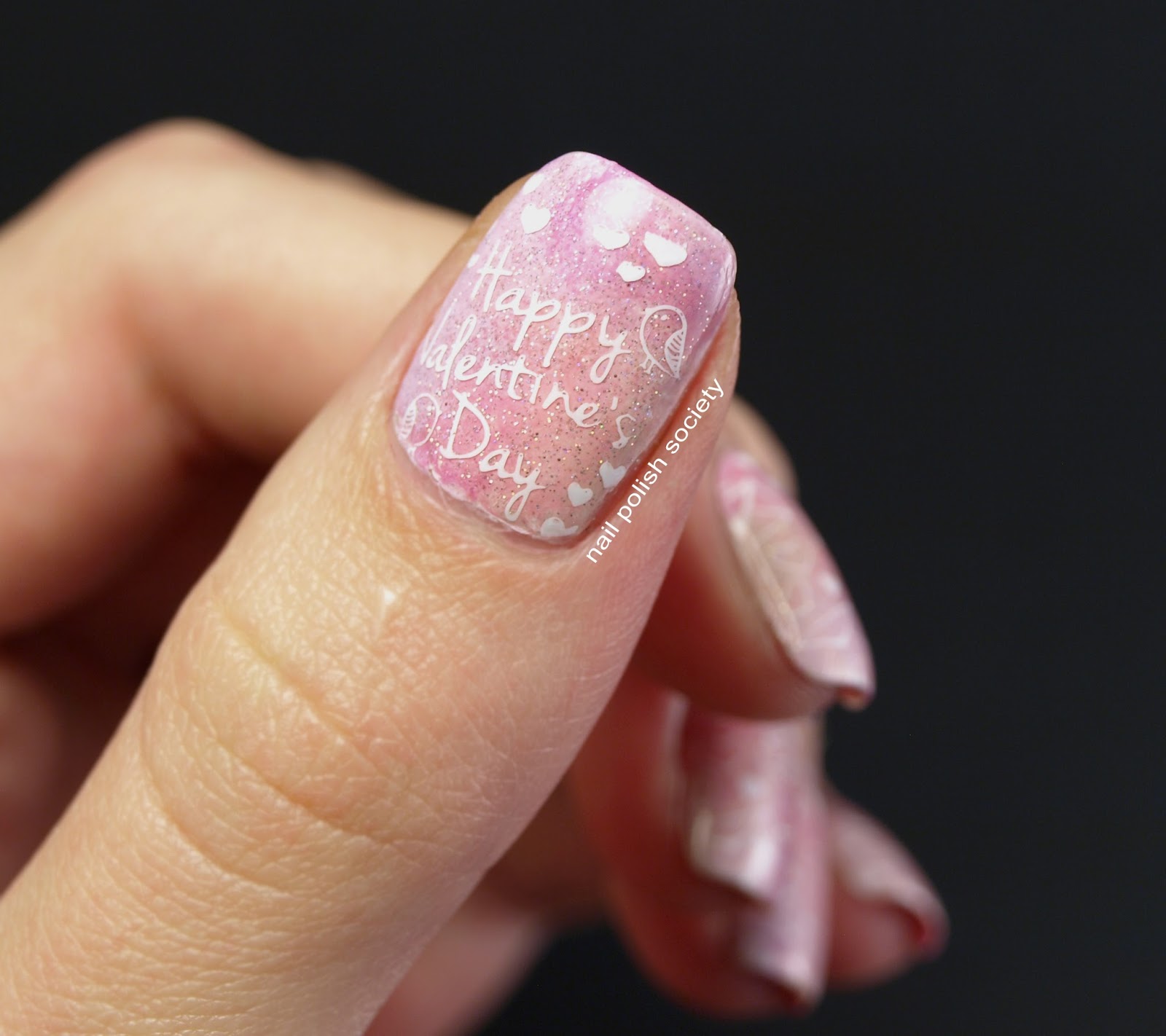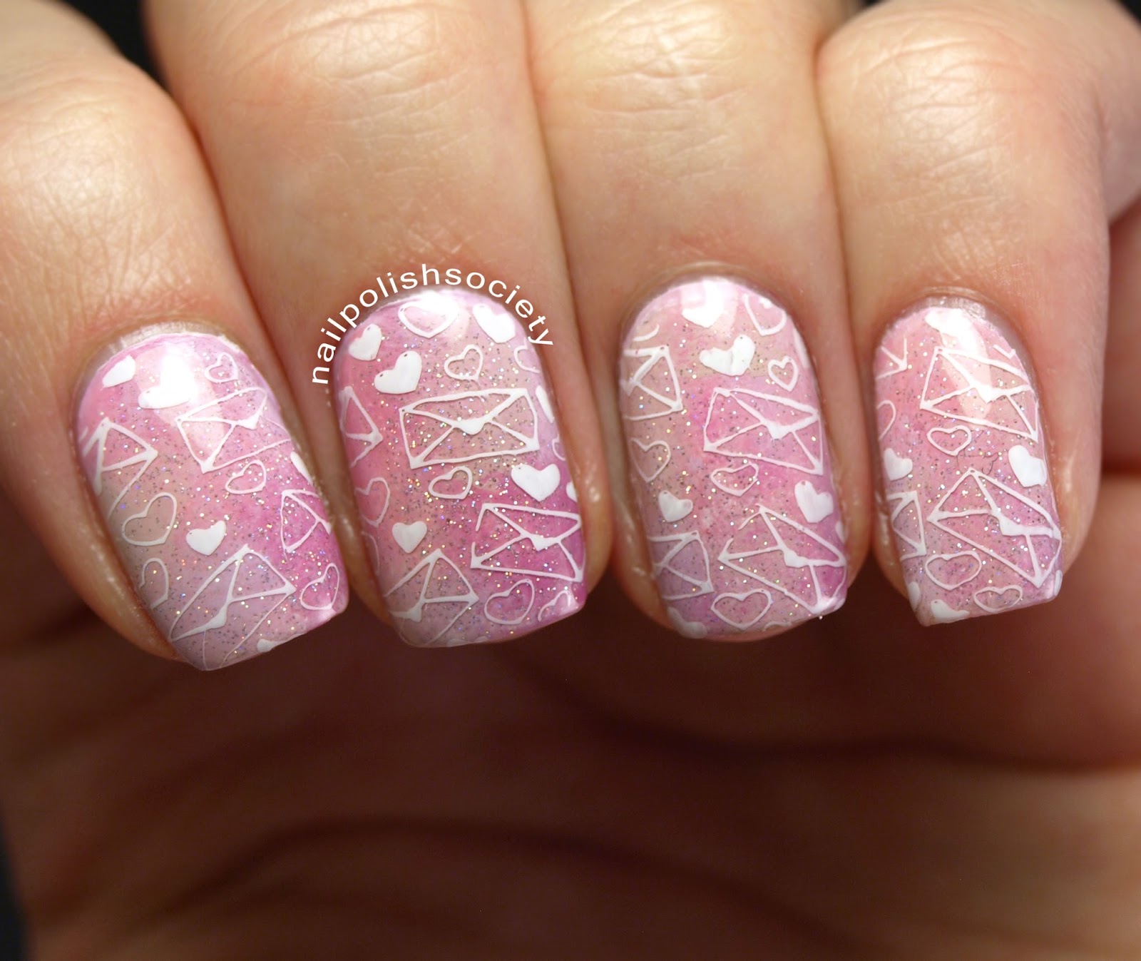 For this mani I started with a base color of OPI Don't Bossa Nova Me Around. Then I dabbed on a few different pinks and light purples with a sponge. I applied a coat of Fairy Dust on top once the colors were mostly dry. I gave that a few minutes to dry before I stamped on the envelope and hearts using Konad Special Polish in white. I finished the look with a fast dry top coat.