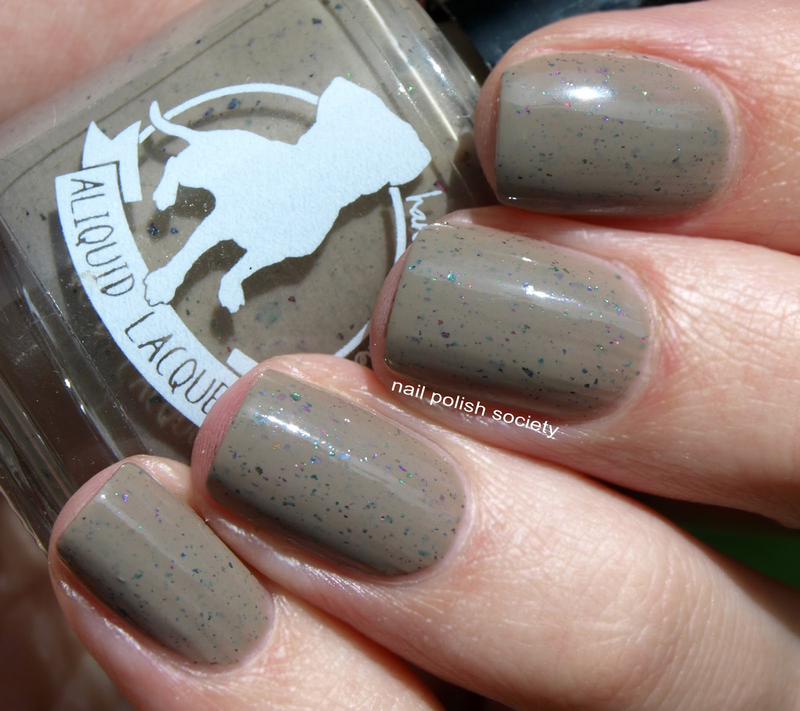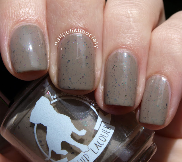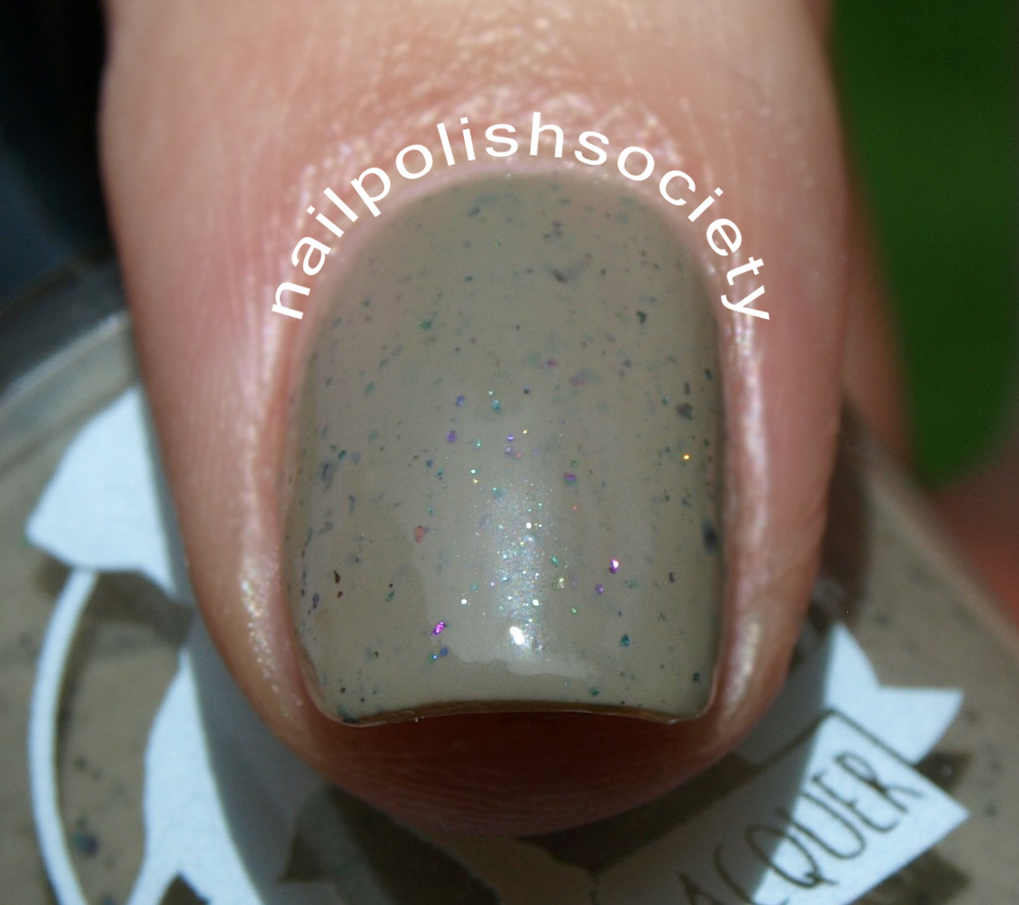 Young Lady of Deep Reflection (Mary Bennet) is described as "a light muted tan with ultrachrome flakies in pink, purple, green, blue and gold." Great formula, and a really unique nude. Two coats, no top coat.