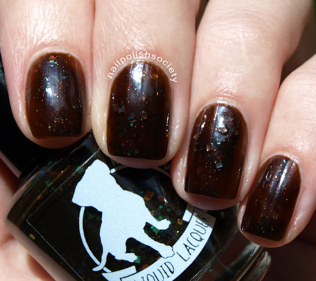 Fine Eyes (Elizabeth Bennet) is described as "a coffee brown jelly with orange-green and green-blue iridescent glitter and a mix of ultrachrome flakies in gold, green and blue." I must apologize for the photos here. Indoors I thought my application looked really good, but for the photos I really should have done a third coat. Point is, this shade is prettier than my photos show. Two coats, no top coat.