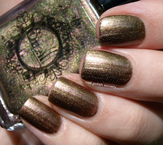 Erasing History is a multichrome (dubbed Magichrome) shifter that goes beyond the usual green to purple shift. This photo captures all the colors fairly well and you can see the green, dusty rose, bronze combination here. The shimmer gives it even one more added dimension which makes it a winner to me. This is two coats, no top coat.