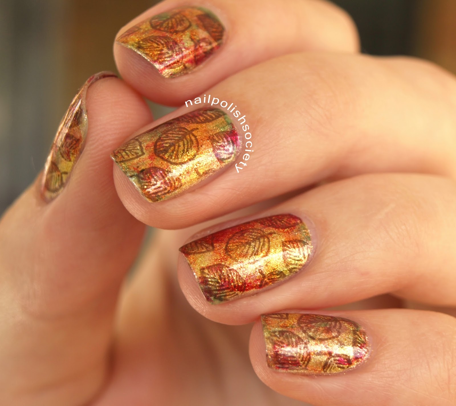 I started with a base of a golden metallic foil polish. Then I blotted over it with a few sheer glass flecked polishes in Autumnal (is that a word?) colors. Over that I stamped a leaf pattern and sealed the deal with a fast drying top coat.