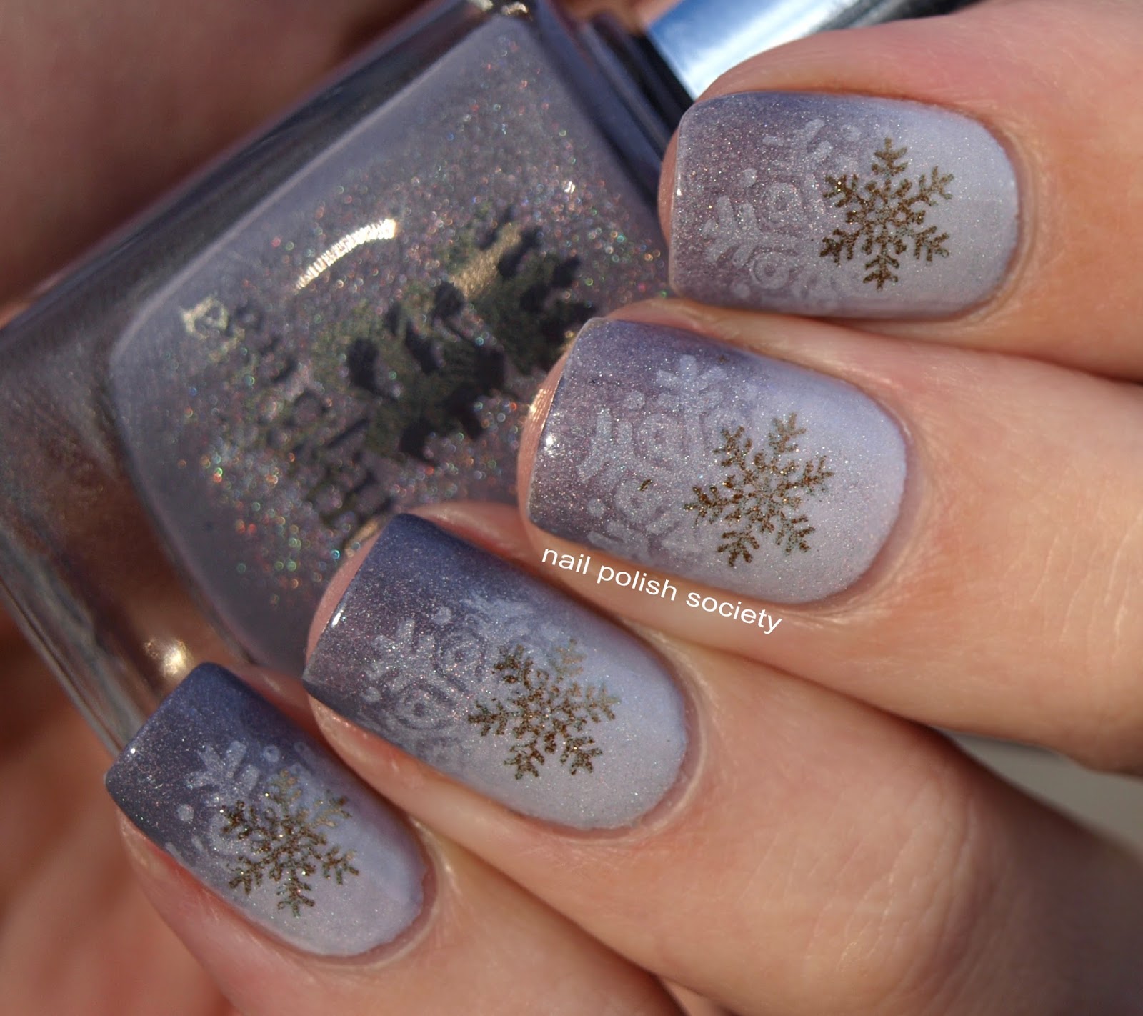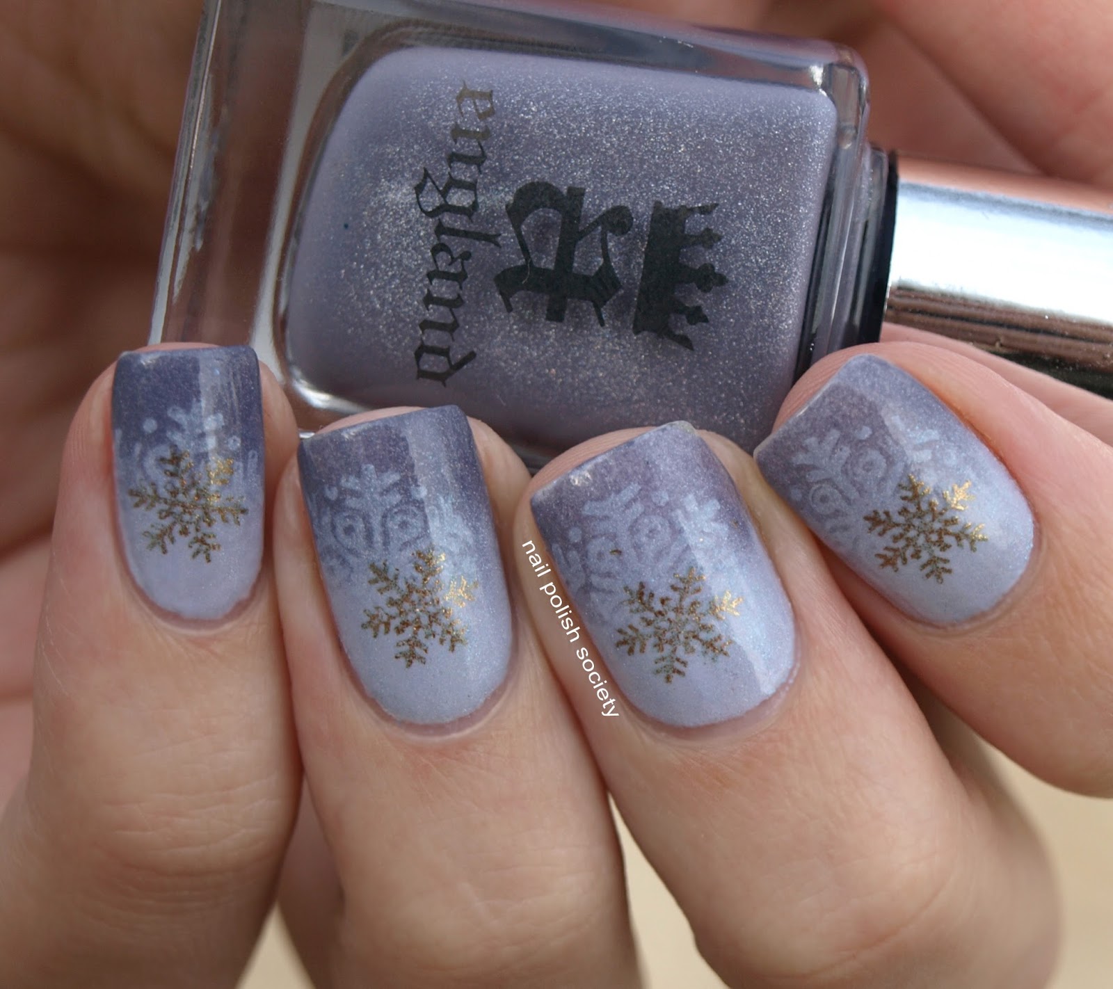 Then I moved on with my second idea which was to just stamp gold snowflakes on. For these I used A England Holy Grail. Although I loved the look of the first one, this second one was a more wearable mani. It's been pretty gray and bleak so far this winter and we haven't had a lot of sun. I took the above photo in the literal 30 seconds of weak sunlight there were that day. You can glimpse a little of the pretty sparkle.