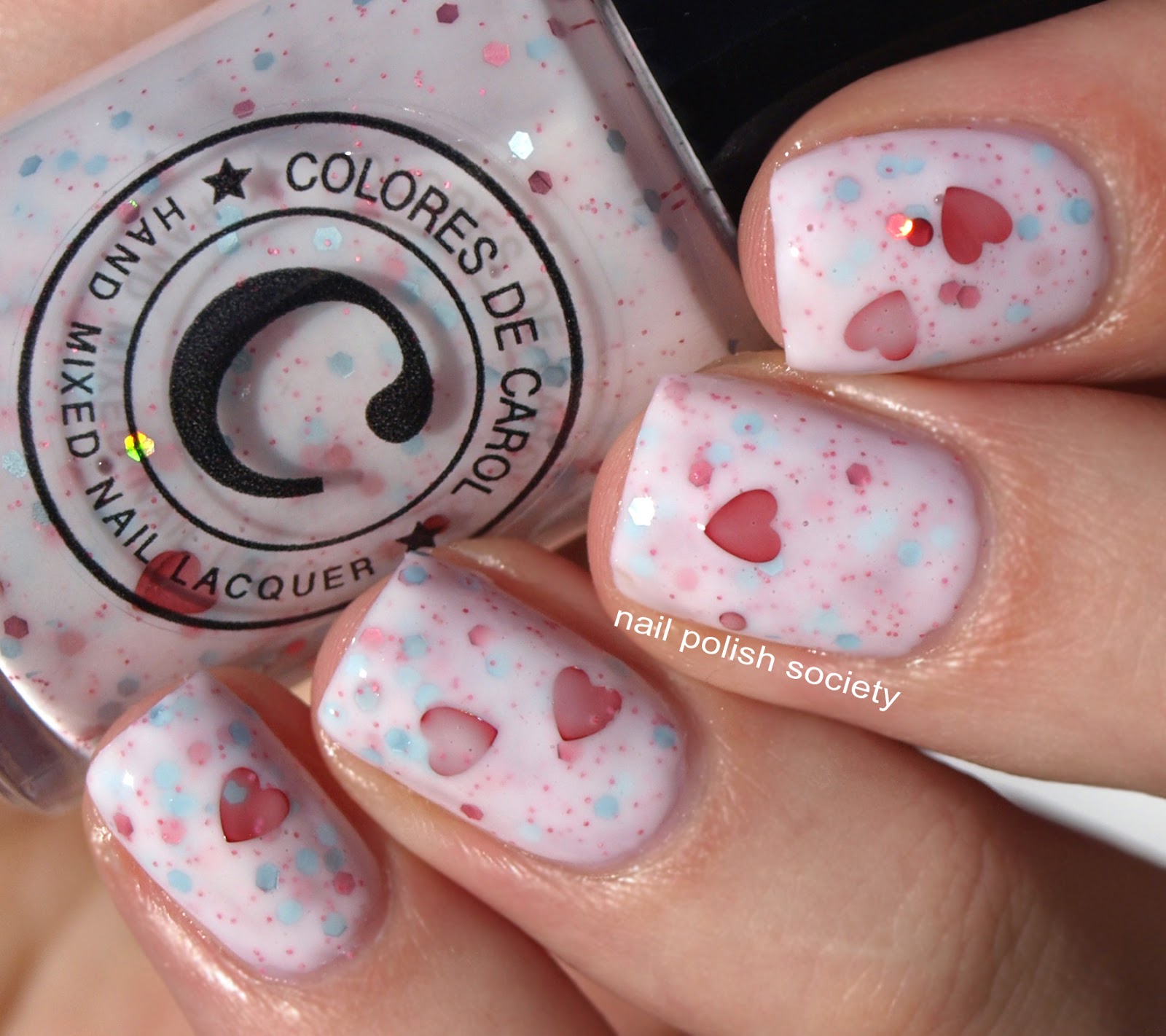 Candy Kisses is a white creme/jelly base with a mix of pink and blue glitter, holographic red glitter, and heart shaped glitter. This polish is just so darn CUTE! My favorite part is the baby blue glitters. The holo glitters get a little hidden by the milky crelly, but occasionally peeks out for a little added bling. I used the glob and spread method for application and with two coats achieved the desired opacity. Shown with top coat.