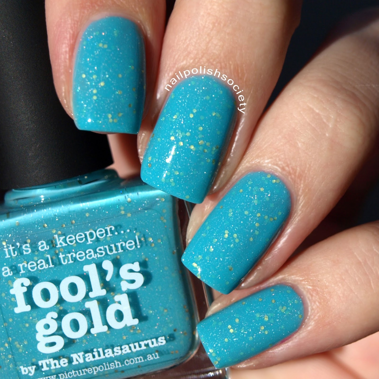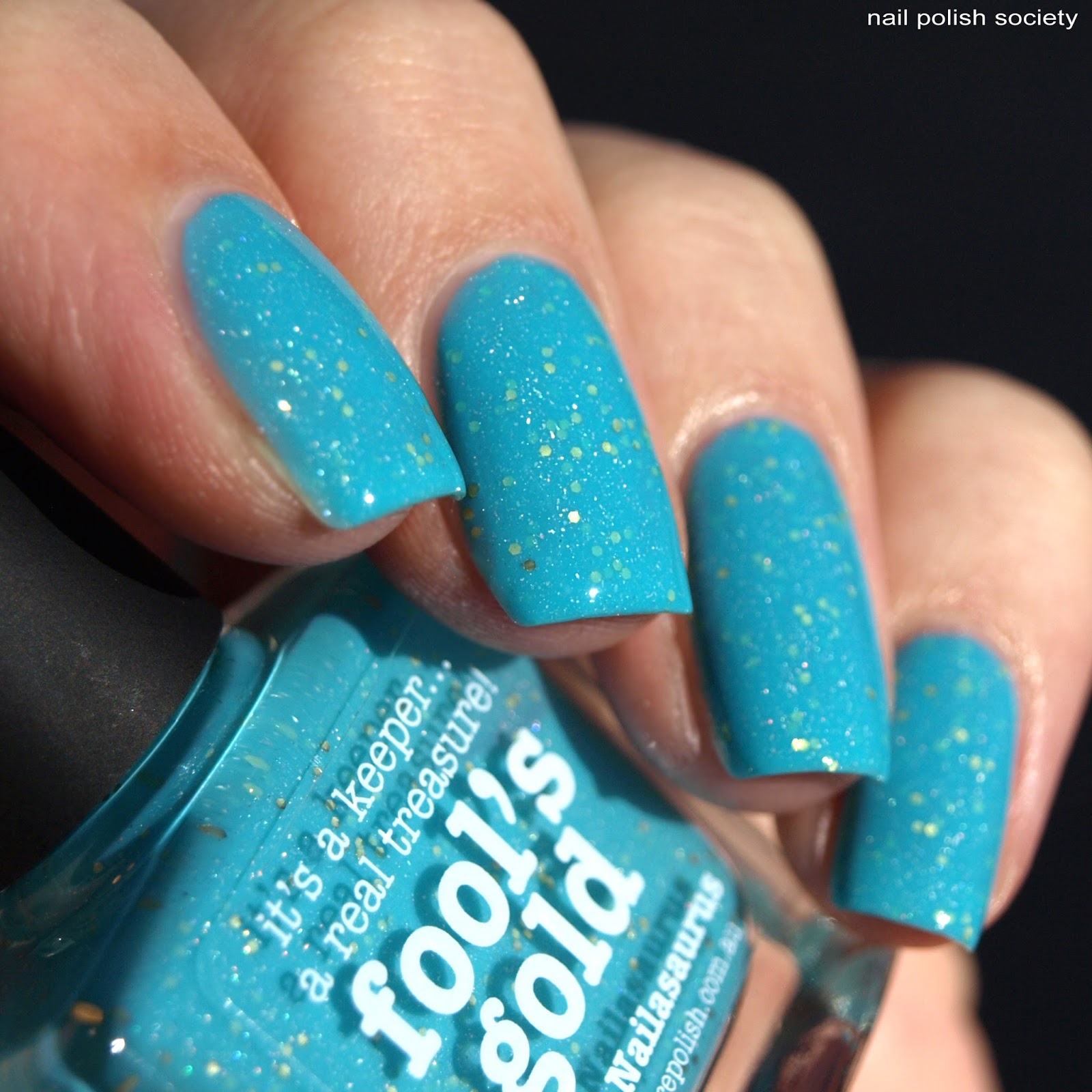 Fool's Gold is a light turquoise jelly with gold glitter and scatter holo. This is another one of their scattered holos that the holo itself isn't very noticeable beyond the visible flecks themselves. I think it works well in this shade so you can really focus on the pretty gold glitter. The jelly is very pigmented so it only took me two smooth coats for this opacity. The formula is great and the glitters distribute well without extra effort.