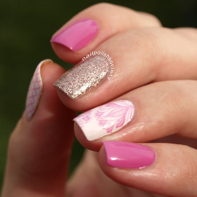 This was my first mani with my UberChic plates. I really, really love the images and variety of the three plates I have. And I really, really want to buy them all. You can see the other two manis I've done using these plate here and here. I like the delicateness of the accent nail image, especially in combination with the girly pink and glitter.