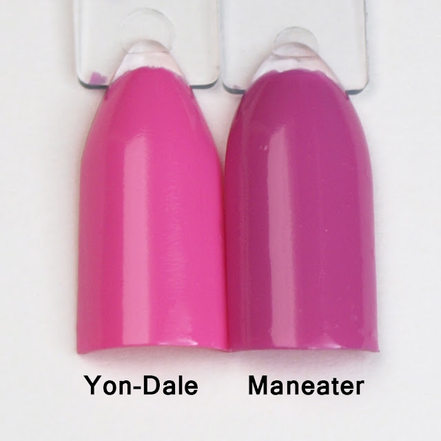 In case you were wondering how Yon-Dale compares to Colores de Carol Maneater, I put them side by side. Maneater is deeper and is a creme/jelly formula compared to the lighter true creme of Yon-Dale.