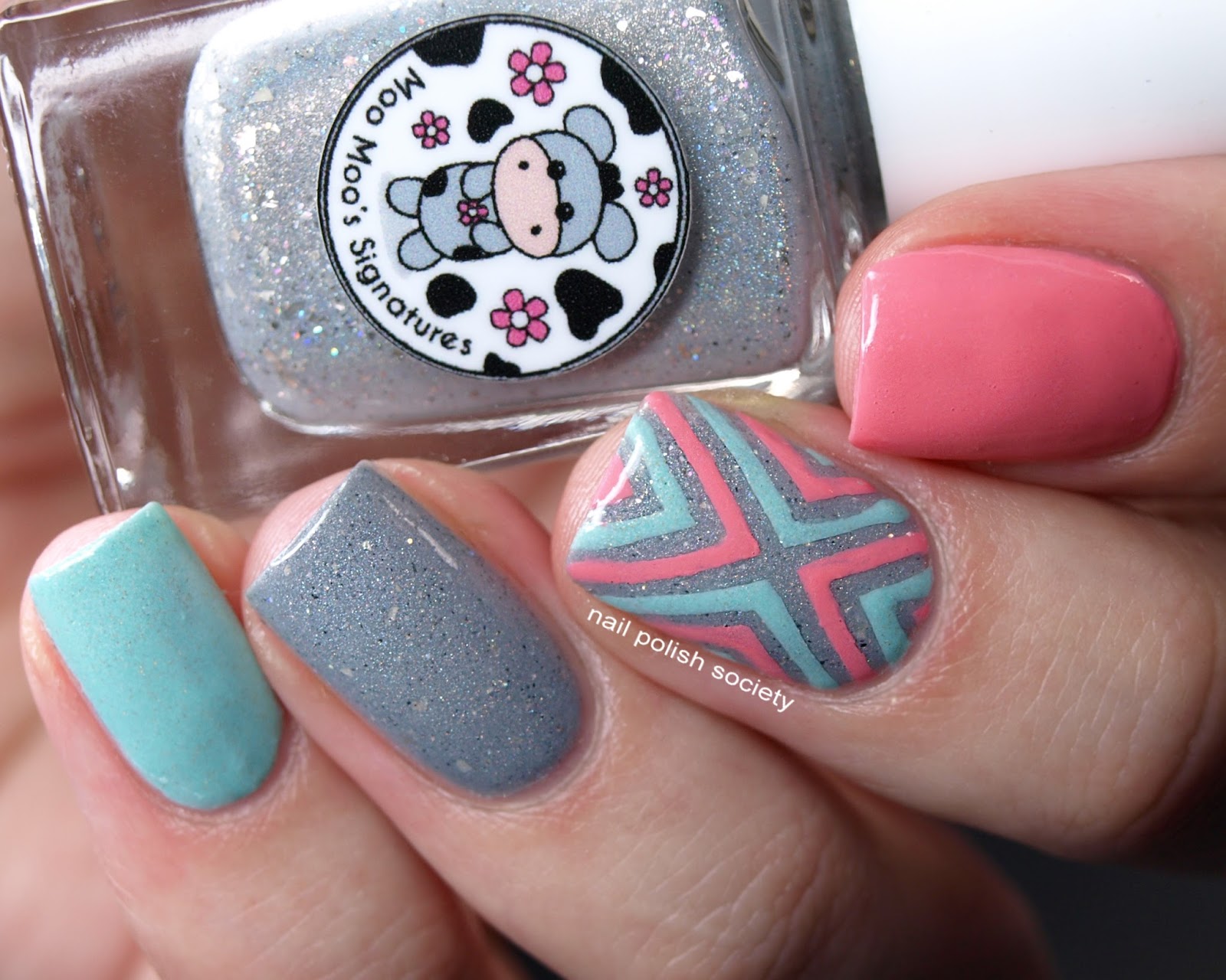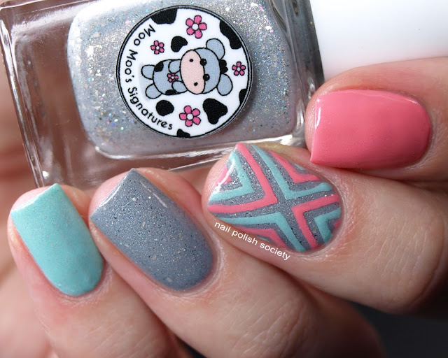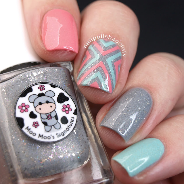 Molly Moo is a really fantastic polish and I have swatch photos to share with you soon. I was a little disappointed in the formulas of the peach and mint shades, as I had such high hopes for those too. Fortunately I was still able to make them work well with the vinyl stencil design and I love the end result!