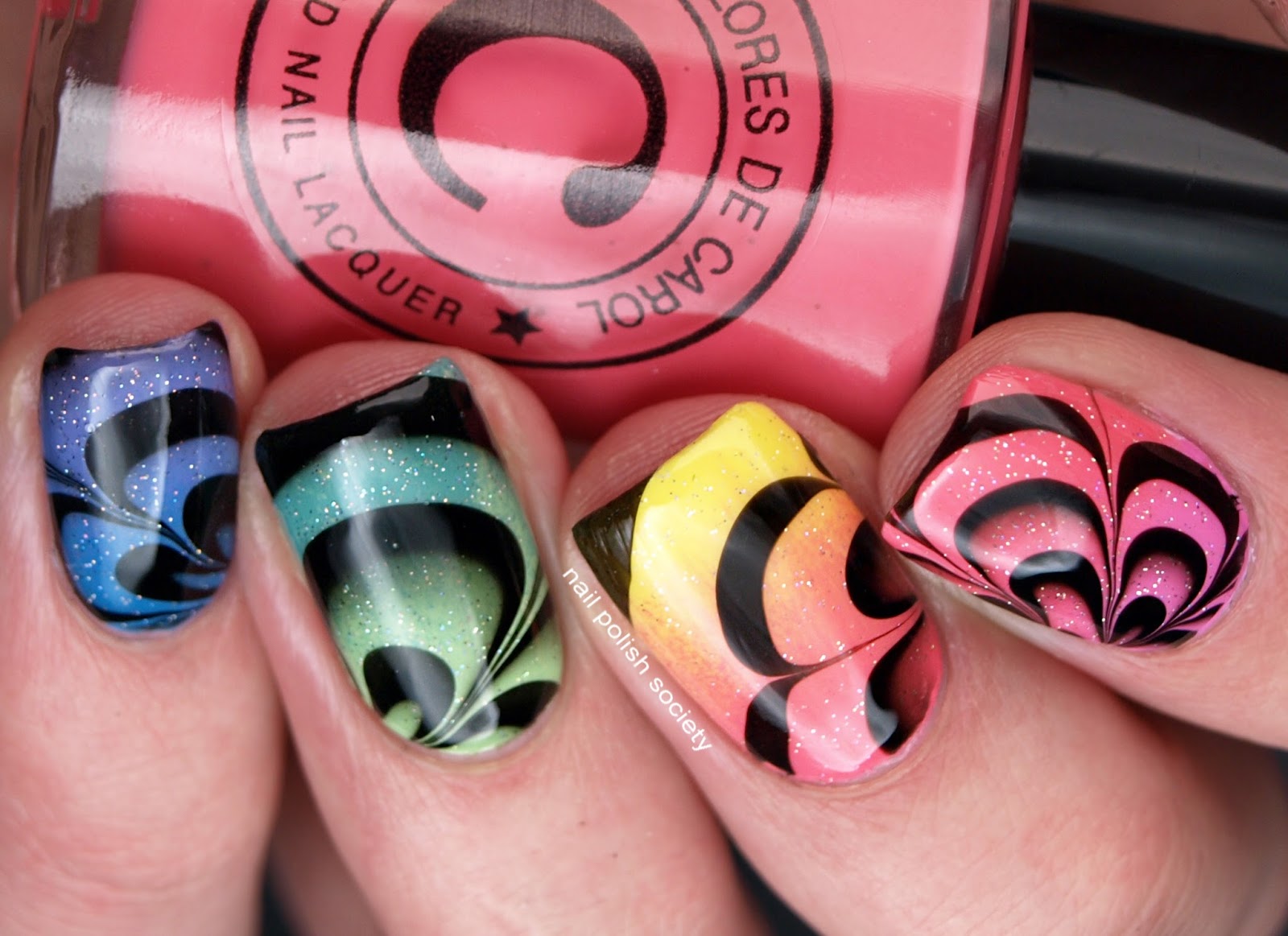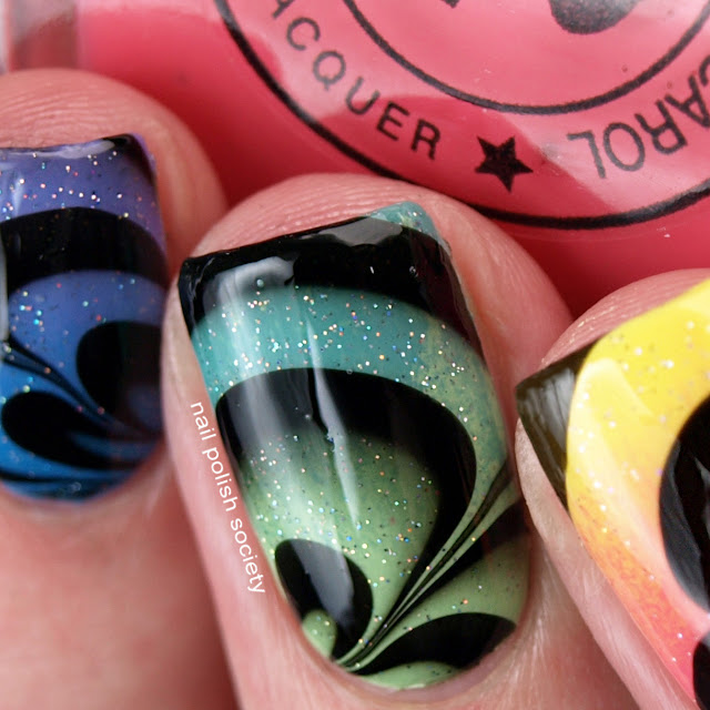 This black and clear water marble over a rainbow base is one I attempted a couple years ago. You can see here that I only got as far as the rainbow gradient because I couldn't get the water marble to work for me. That was before I discovered Pipe Dream Polish Clearwater. Now don't get me wrong, I still struggled with this. As I am madly typing this out I am a half zombie because I stayed up waaay too late working on it. Despite the challenges and setbacks I had, I finally achieved a look that works! Not perfect, but it still looks pretty cool!