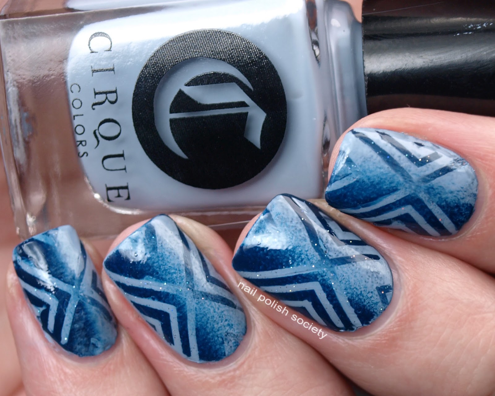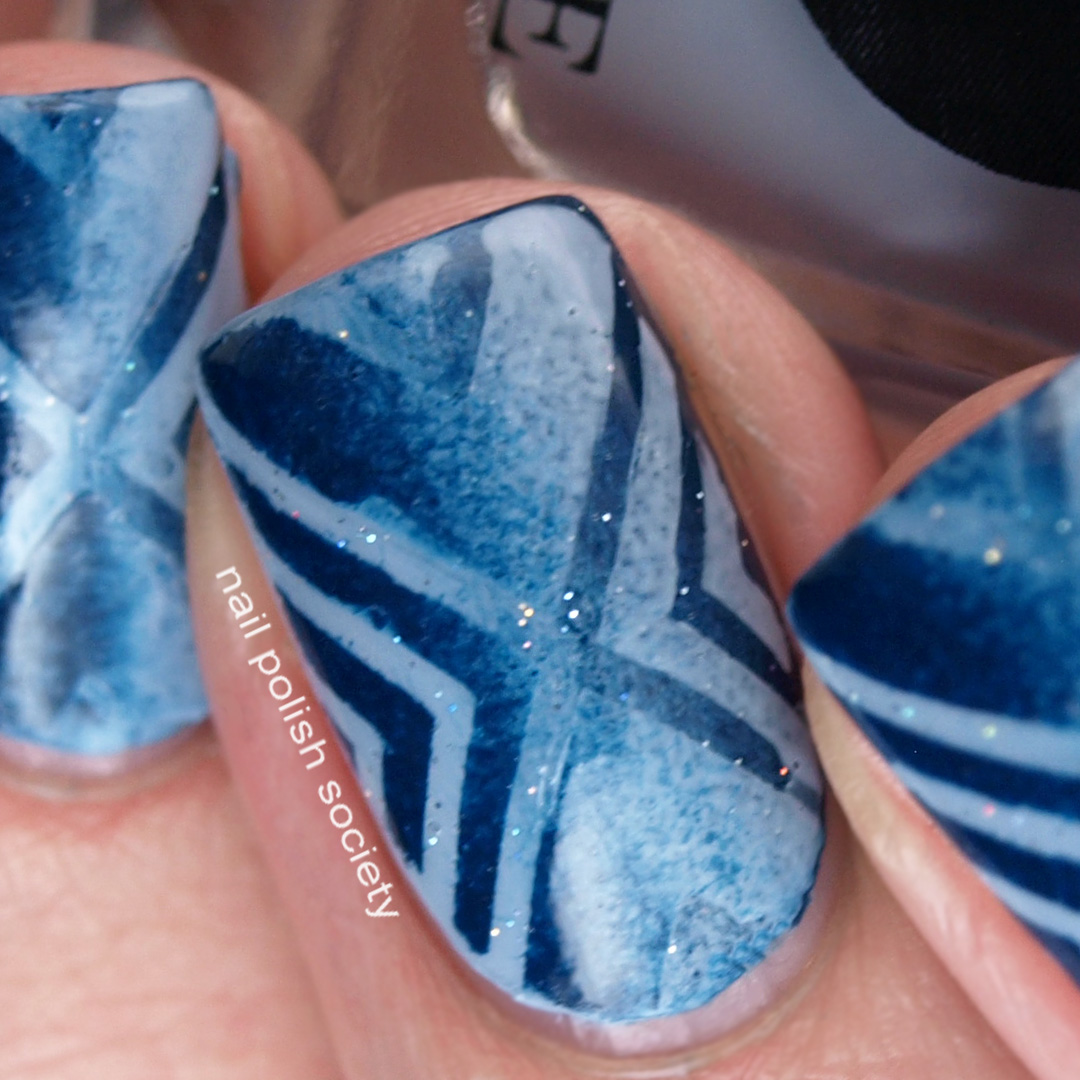 I used two contrasting shades of blue and sponged on a vertical gradient. Then I added a coat of Out The Door Northern Lights- a fast drying top coat with holographic glitter. Once that was all dry I clipped off some of the middle parts of the nail vinyls, then placed them on my nails. I sponged the gradient again, now in the opposite direction, over the vinyls. I quickly removed the vinyls (some removed more cleanly than others) and let dry for a couple minutes before finishing with a clear fast drying top coat.
