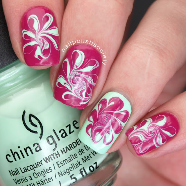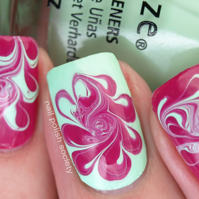 To create these decals I began with a clear coat on my UberMat. Over the clear coat I created a thick rectangular border of polish. Working while the polish was wet I immediately added the contrasting polish inside the border, filling in the empty space completely. Then I took an orange stick (anything small and pointy should work) and starting from the border color I dragged it into the middle, then out again in counter-clockwise swirling movements.