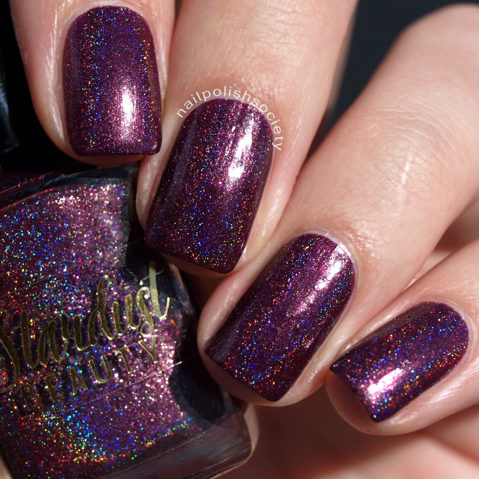 Take Me Gnome Tonight by Stardust Beauty is a vampy deep berry purple holographic with purple shimmer. Drema does these feminine shades so well, and this one is so flattering on me. The first coat was a little patchy, but it built up to the right opacity with just two coats. Shown without top coat.