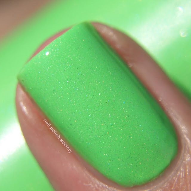 This Lime Around is a light neon green creme with subtle shimmer and holo. This was three coats and top coat.