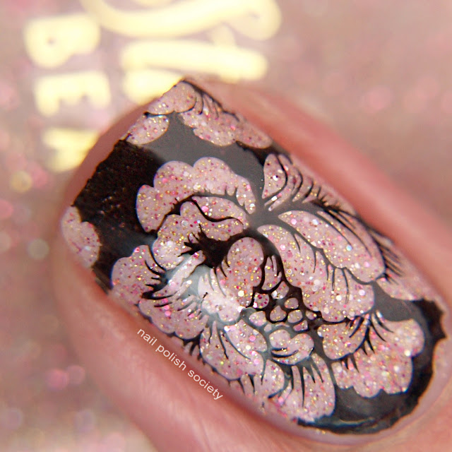 For this look I went with something soft, feminine, and sexy. This glitter crelly works perfectly in the negative space image. On my index finger I stamped with a gold polish first, to make the pink I stamped over it pop.