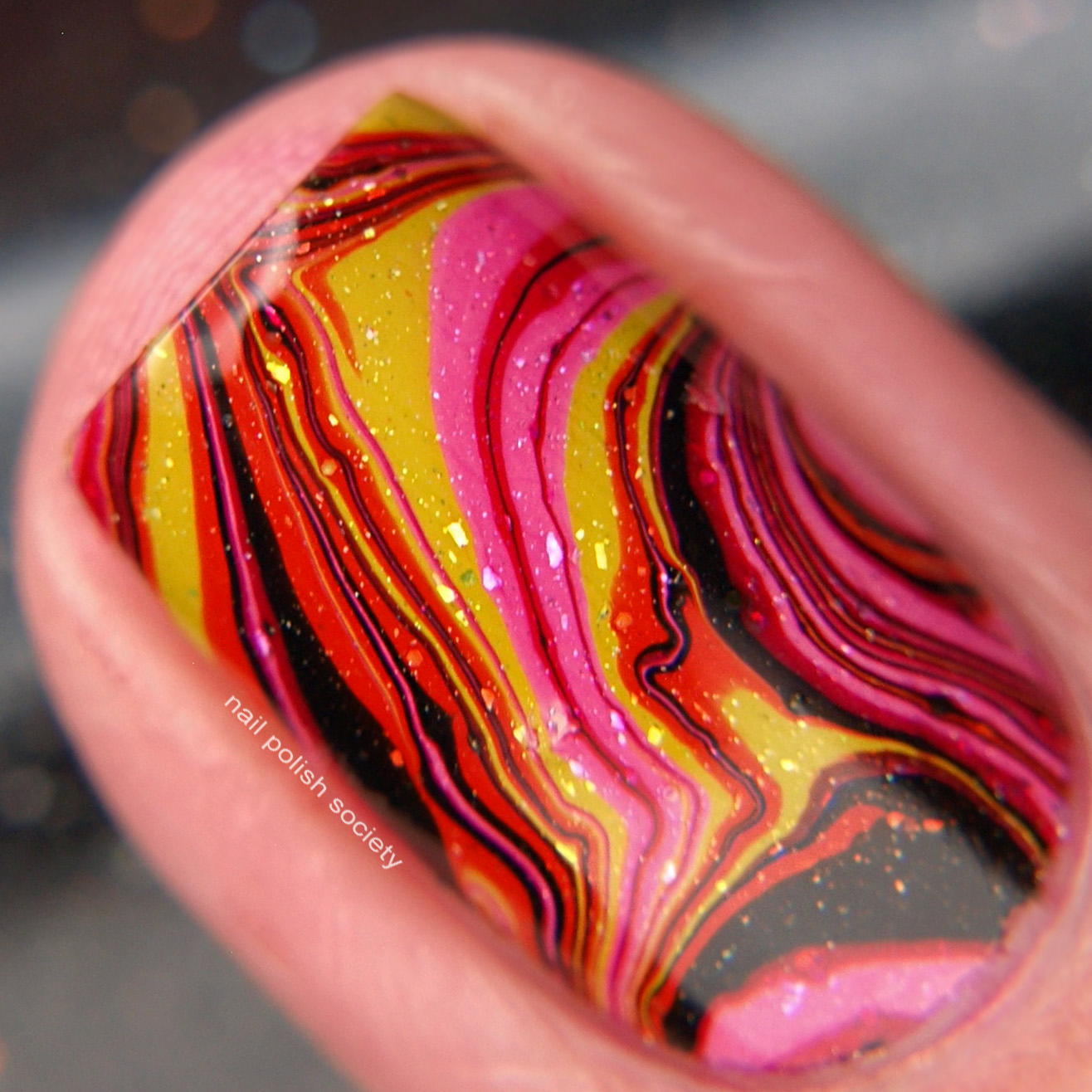 For this look I started with a medium nude polish as my base color. I experimented making different uniform water marble designs until I realized these polishes really lend themselves to a more organic feel. The glitter and flakes really make it look like a real stone or marble. You know, like those funky pink, green, and orange stones you see all the time.