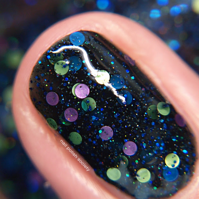 Belles of the Balls is a blackened blue jelly base "with black and blue holo micro glitter and neon dot glitter". This one looks like a fun Halloween shade to me, don't you think? The application took a little care but it didn't present too much trouble. This was two coats, and I used two coats of top coat to make it nice and smooth and shiny.
