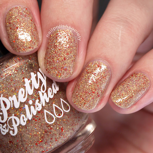 Debbie Darling "is a light golden crelly base packed with red and gold glitter". This has a nice and easy application. I used two coats with a little touch up where it was needed. Shown with top coat.