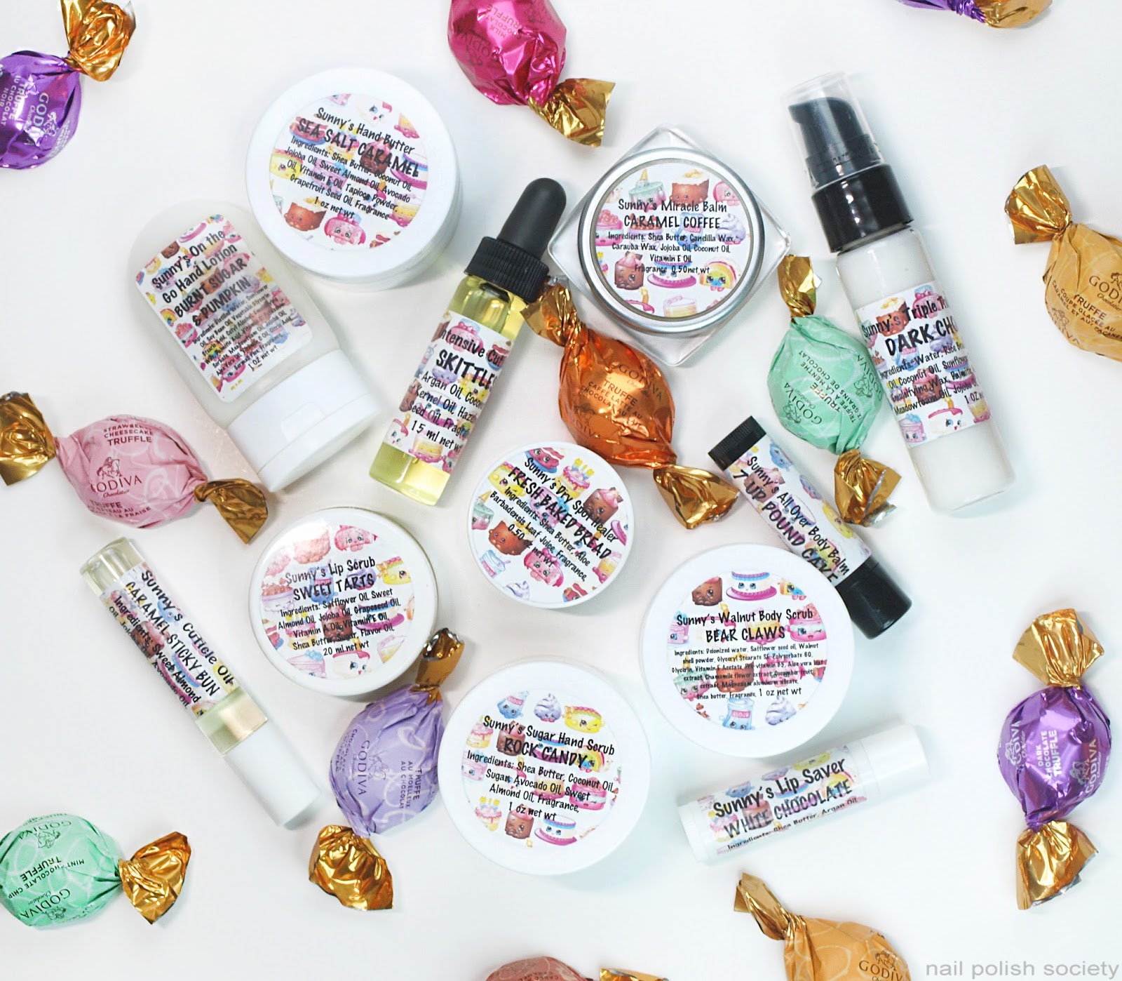 Get out your bibs, 'cause you're going to be drooling by the end of this post. Sunny's Body Products has created a delectable twelve piece food scented sampler box ranging from coffee to candy to fresh baked bread. Some of these are so delicious you'll be tempted to taste them, I'm totally serious. Best part is, they are all calorie free!