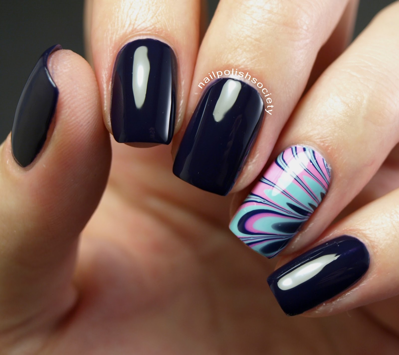Hey guys! How you all doing? I'm pretty stoked right now because I just bought plane tickets to Washington for a visit back home in a couple months. Yay! I can't wait to see my family and friends. So anyway, about the nails. I love this mani! The combination of dark blue and the bright accent nail is a fun contrast. I was also soo pleased about how the water marble turned out. I got this on the first try!